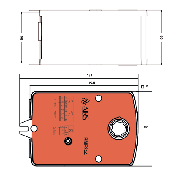 Электропривод устанавливается на клапан с квадратным приводным валом размером 12 мм и закрепля- ется через крепежные отверстия ø6 мм к корпусу клапана