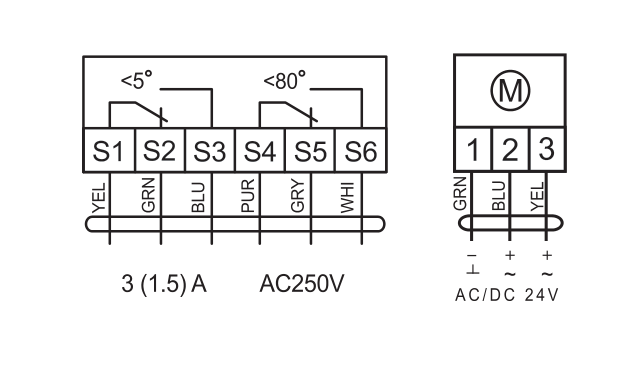 Электропривод содержит два встроенных переключателя для сигнализации положения створки при углах поворота на 5° и 80° Промежуточное положение определяется по механическому указателю