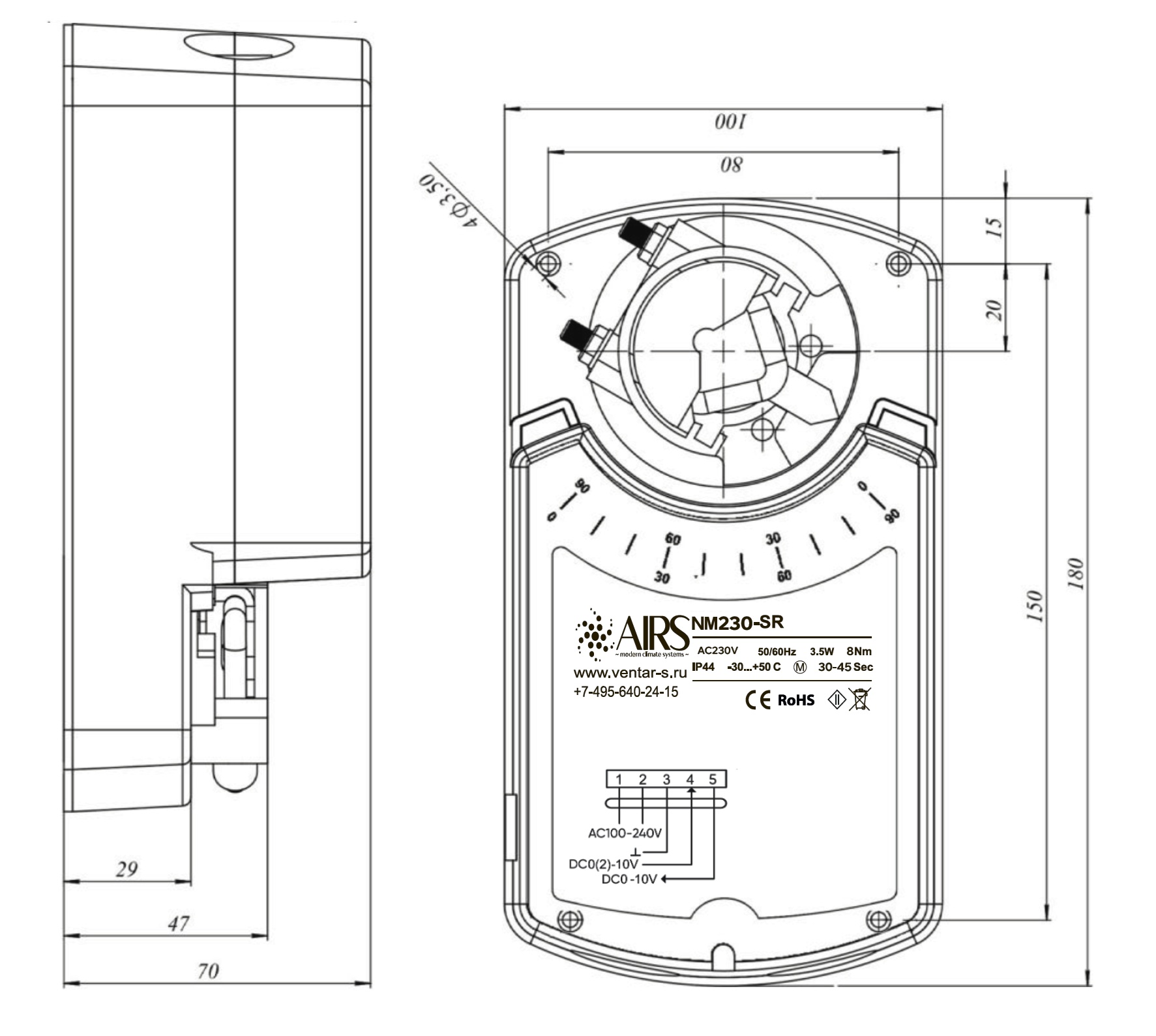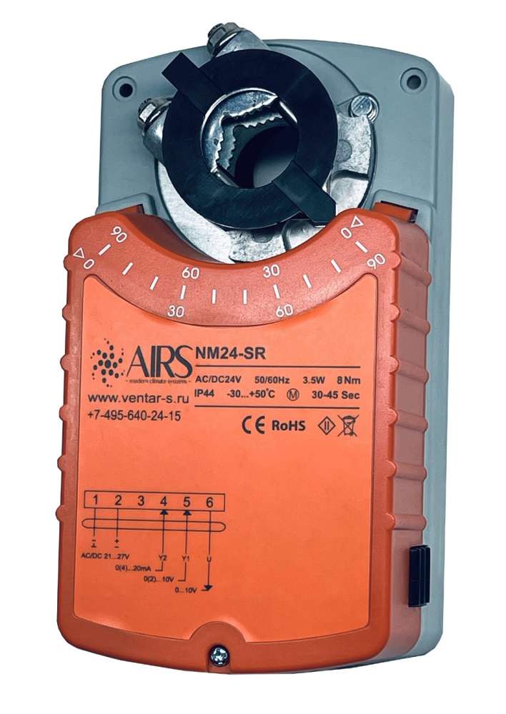 Электропривод легко устанавливается непосредственно на вал створки клапана круглого сечения 10...20 мм и закрепляется с помощью универсального крепежного устройства. К корпусу клапана электропривод крепится при помощи универсальной крепежной пластины или непосредственно на корпус клапана.