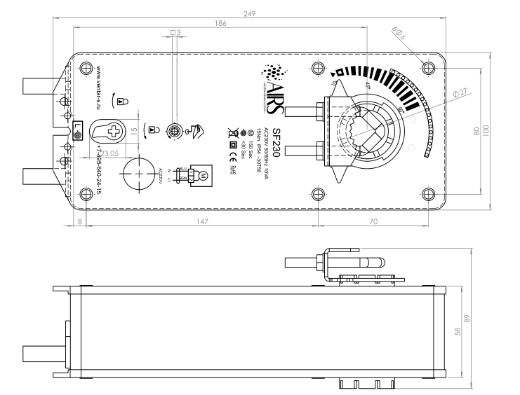 Возможно ручное управление приводом, а также фиксирование его в любом положении. Разблокировка осуществляется либо вручную, либо автоматически при подаче питания на привод. Управление осуществляется прилагаемым в комплекте ключом.