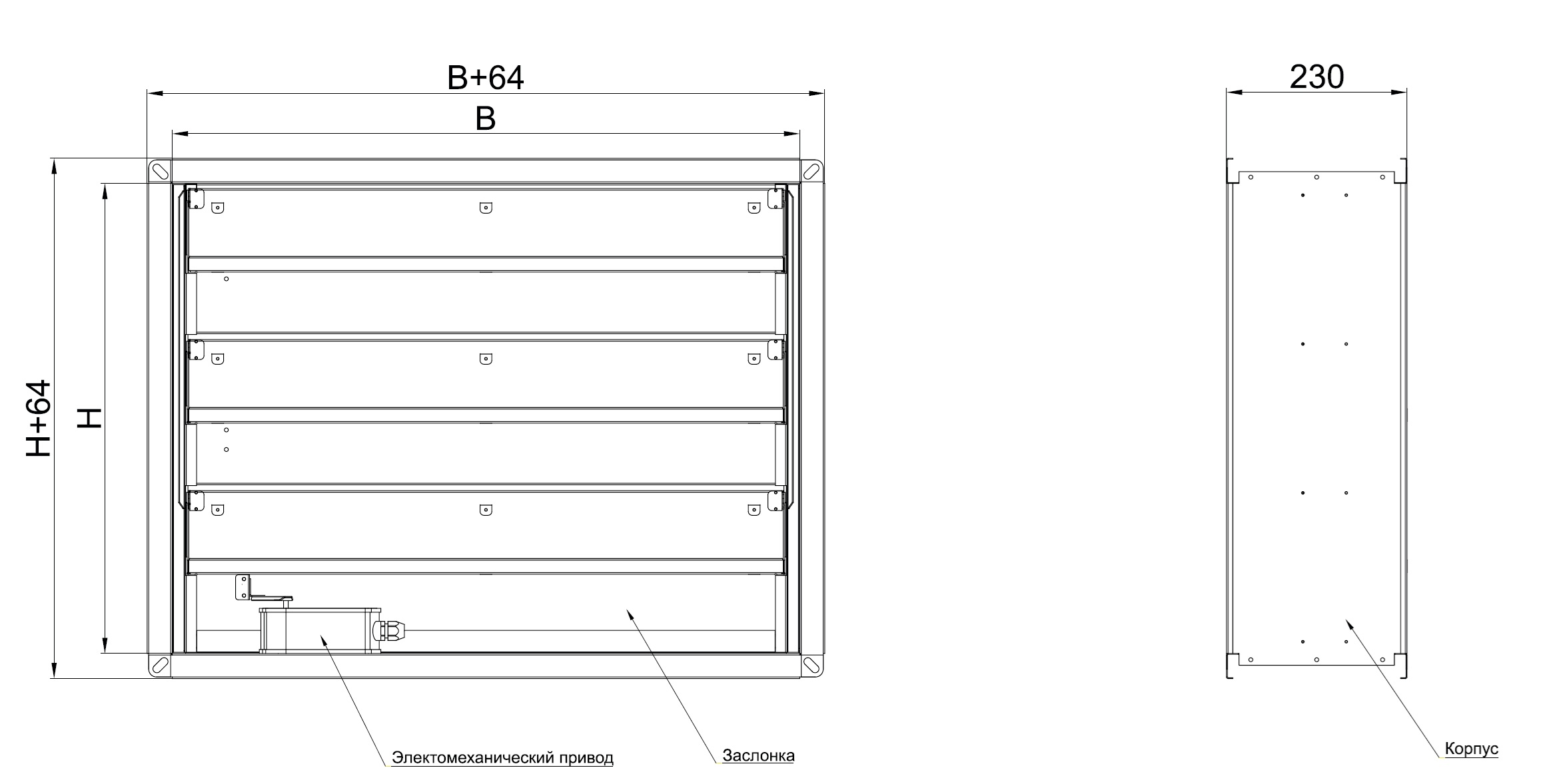 Корпус прямоугольного клапана, в зависимости от исполнения, имеет глубину от 200 мм до 250 мм и конструктивно аналогичен отрезку воздуховода такой же длины. Корпус стенового клапана, в зависимости от исполнения, имеет глубину от 160 мм до 250 мм. Фланец на канальных клапанах шириной 30 мм, на стеновых клапанах 45 мм. Заслонки выполнены из оцинкованной или нержавеющей стали.