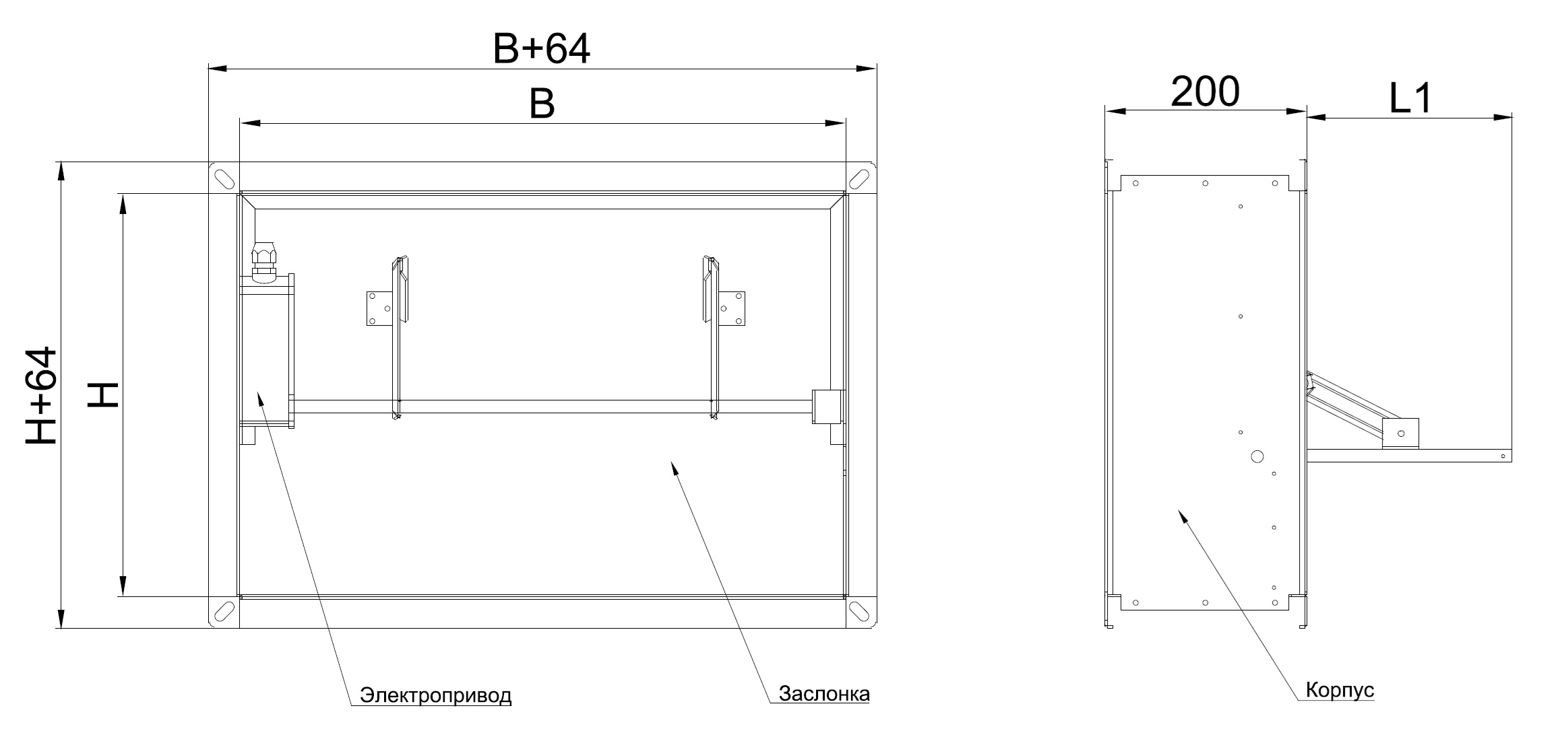 Корпус прямоугольного клапана, в зависимости от исполнения, имеет глубину от 200 мм до 250 мм и конструктивно аналогичен отрезку воздуховода такой же длины. Корпус стенового клапана, в зависимости от исполнения, имеет глубину от 160 мм до 250 мм. Фланец на канальных клапанах шириной 30 мм, на стеновых клапанах 45 мм. Заслонки выполнены из оцинкованной или нержавеющей стали.