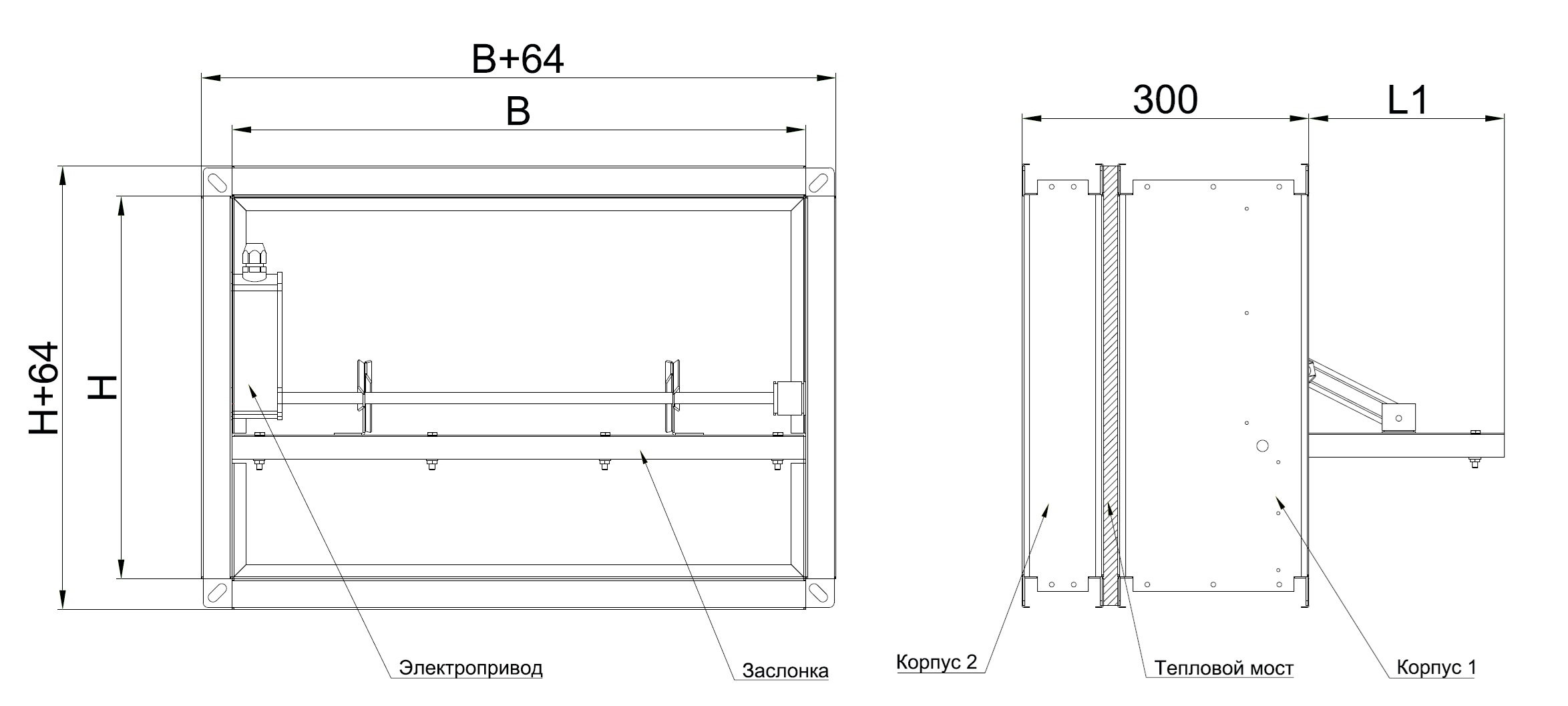 Корпус, в зависимости от огнестойкости и исполнеия клапана имеет глубину от 200 мм до 250 мм и конструктивно аналогичен отрезку воздуховода такой же длины. Фланцы на канальных клапанах шириной 30 мм., на стеновых клапанах 45 мм. Заслонки по типу многослойный сэндвич изготавливается из огнеупорной плиты с двух сторон закрытой оцинкованными металлическими листами.