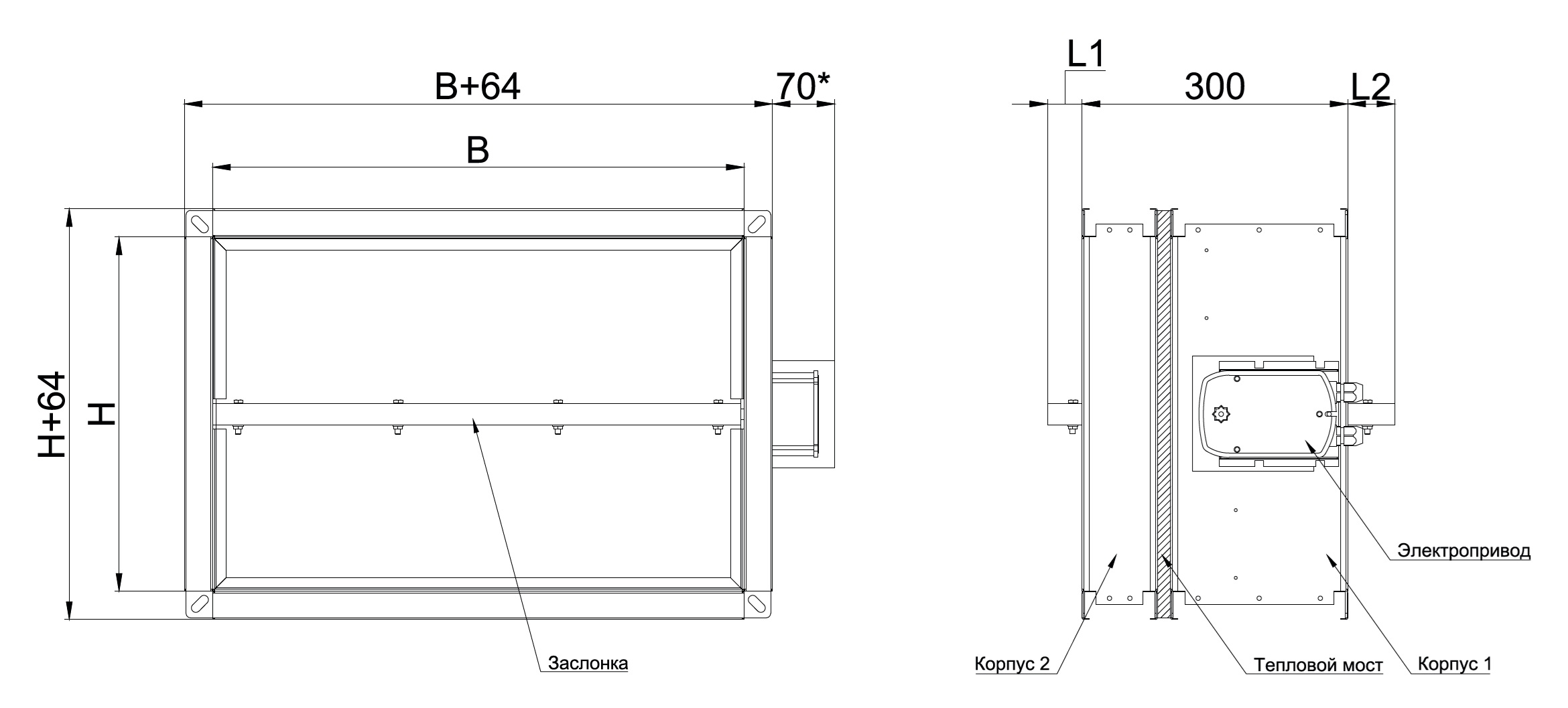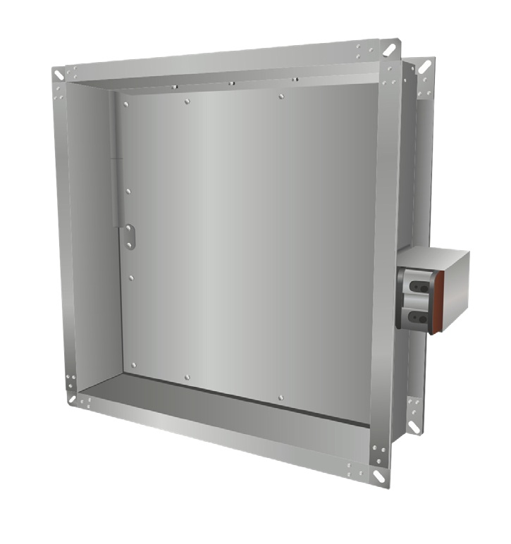 Корпус, в зависимости от огнестойкости и исполнеия клапана имеет глубину от 200 мм до 250 мм и конструктивно аналогичен отрезку воздуховода такой же длины. Фланцы на канальных клапанах шириной 30 мм., на стеновых клапанах 45 мм. Заслонки по типу многослойный сэндвич изготавливается из огнеупорной плиты с двух сторон закрытой оцинкованными металлическими листами.