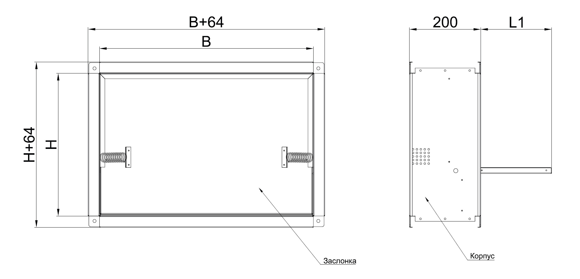 Корпус, в зависимости от исполнения клапана, имеет глубину от 180 мм до 200. Фланцы на канальных клапанах шириной 30 мм., на стеновых клапанах 45мм. Заслонка коробчатого типа набивается огнезащитным материалом. В качестве уплотнителя используется противопожарный уплотнитель (термоактивная лента). При перепаде давления заслонка(ки) открываются.При снятии перепада давления пружины возвращают заслонку в нормальное положение.