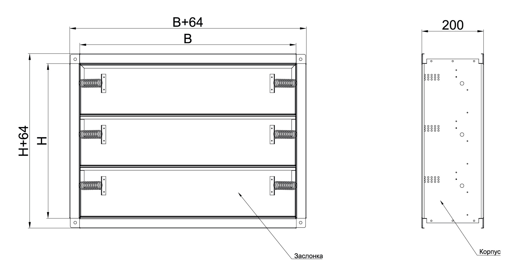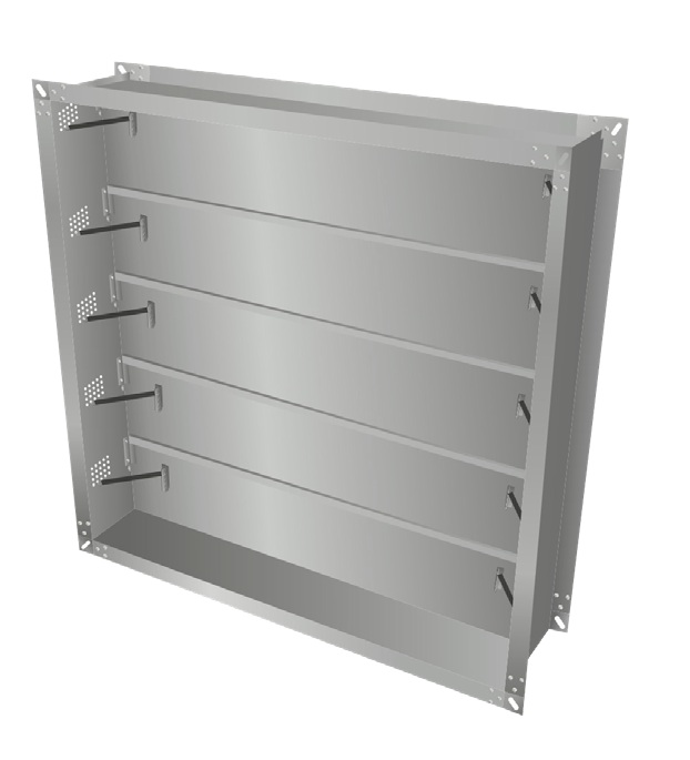 Корпус, в зависимости от исполнения клапана, имеет глубину от 180 мм до 200. Фланцы на канальных клапанах шириной 30 мм., на стеновых клапанах 45мм. Заслонка коробчатого типа набивается огнезащитным материалом. В качестве уплотнителя используется противопожарный уплотнитель (термоактивная лента). При перепаде давления заслонка(ки) открываются.При снятии перепада давления пружины возвращают заслонку в нормальное положение.