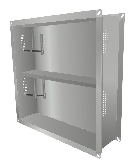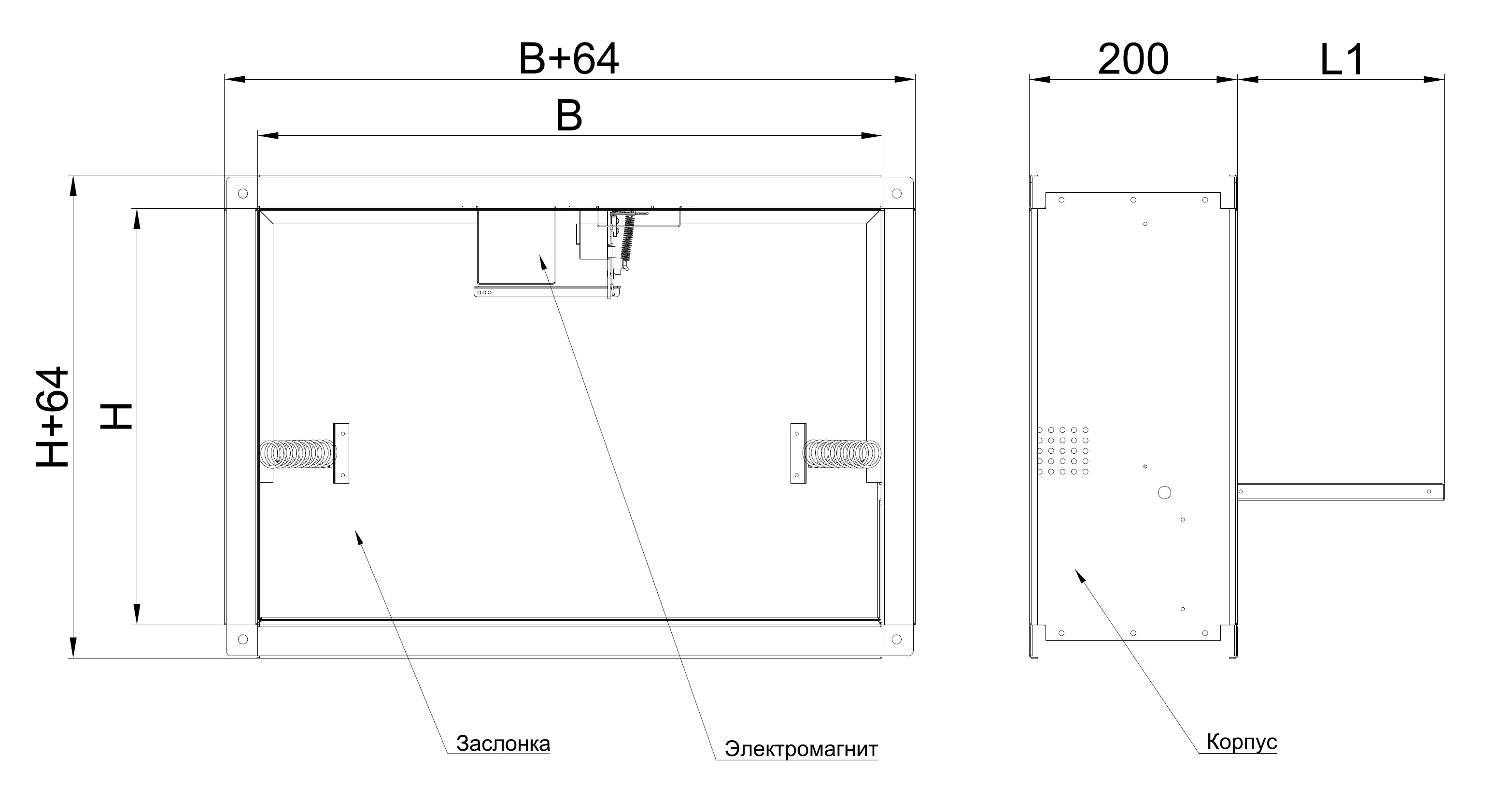Корпус, в зависимости от исполнения клапана, имеет глубину от 180 мм до 200. Фланцы на канальных клапанах шириной 30 мм., на стеновых клапанах 45мм. Заслонка коробчатого типа набивается огнезащитным материалом. В качестве уплотнителя используется противопожарный уплотнитель (термоактивная лента). При перепаде давления заслонка(ки) открываются.При снятии перепада давления пружины возвращают заслонку в нормальное положение.