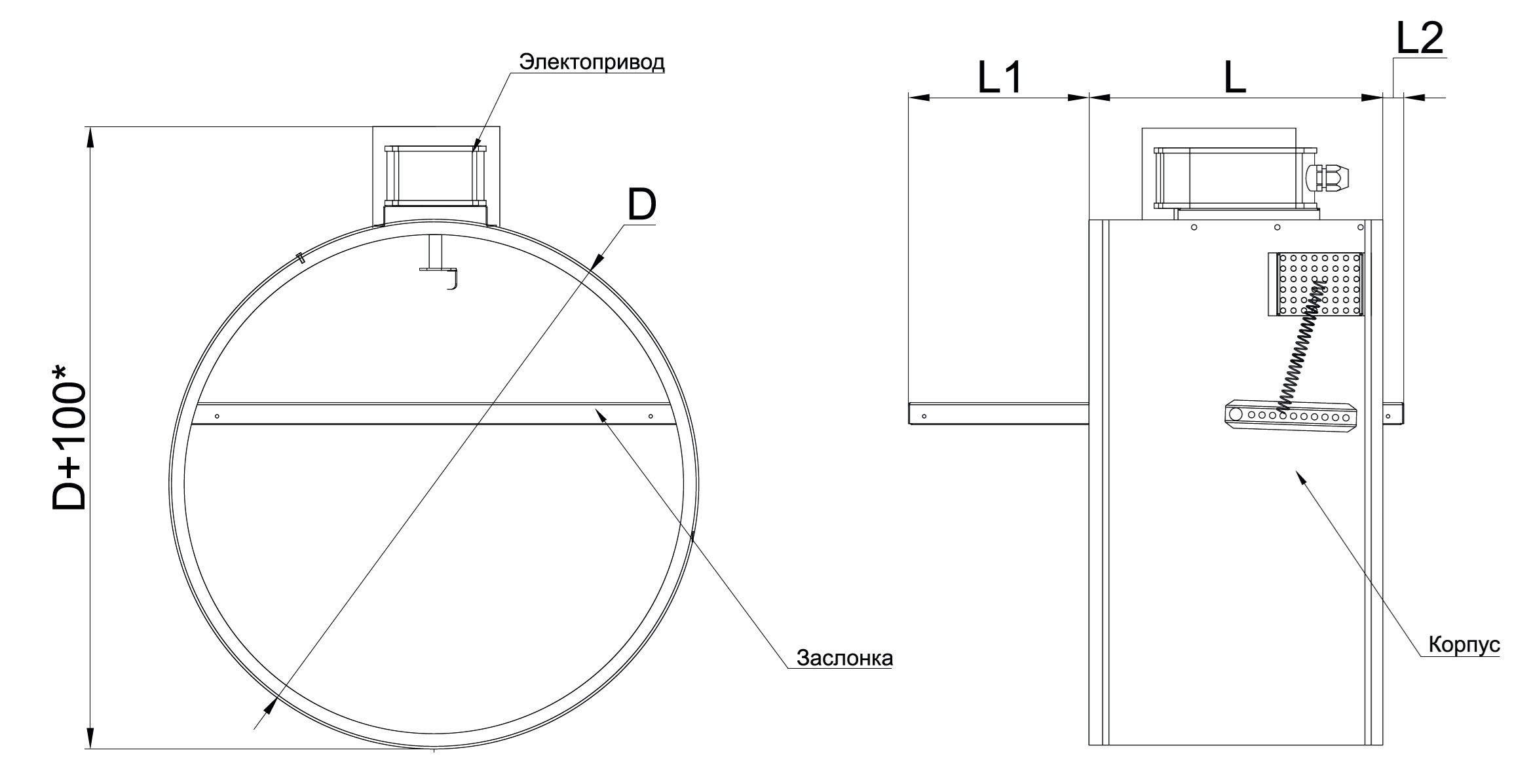 Клапан противопожарный (НЗ)КОМ круглого сечения состоит из корпуса, изготовленного из оцинкованной или нержавеющей сталей толщиной 1 мм, огнеупорных одной или нескольких заслонок из негорючих минеральных материалов. Предусмотрена возможность комплектации электромеханическим приводом в качестве толкателя. Размещение привода снаружи клапана. Корпус имеет глубину 300 мм и конструктивно аналогичен отрезку воздуховода такой же длины. Соединение фланцевое. Заслонки, по типу многослойный сэндвич, изготавливается из огнеупорной плиты с двух сторон закрытой оцинкованными или нержавеющими металлическими листами. В качестве уплотнителя используется противопожарный уплотнитель (термоактивная лента).