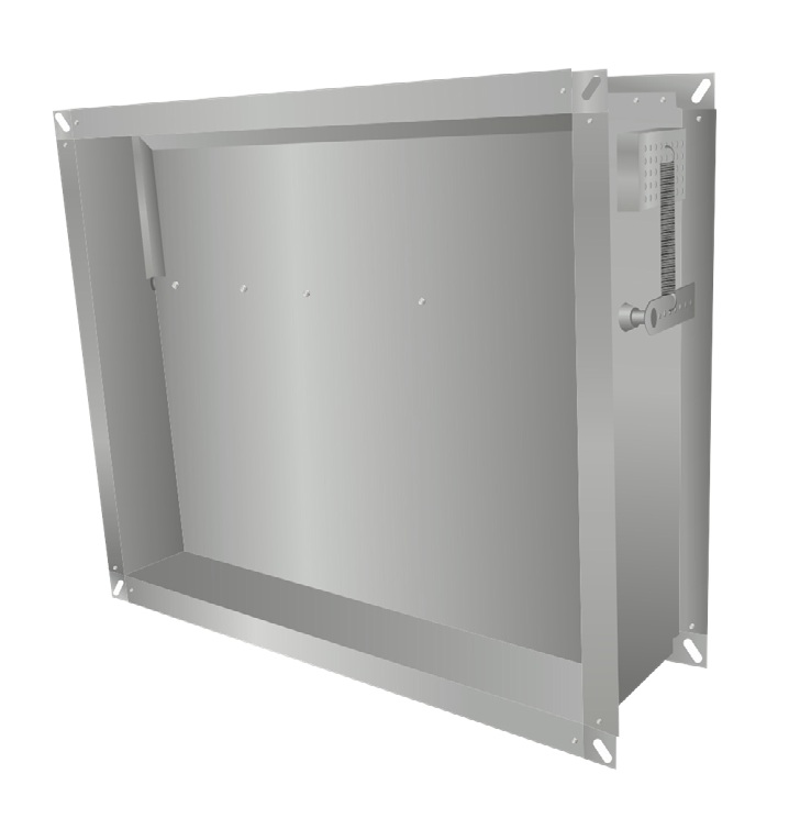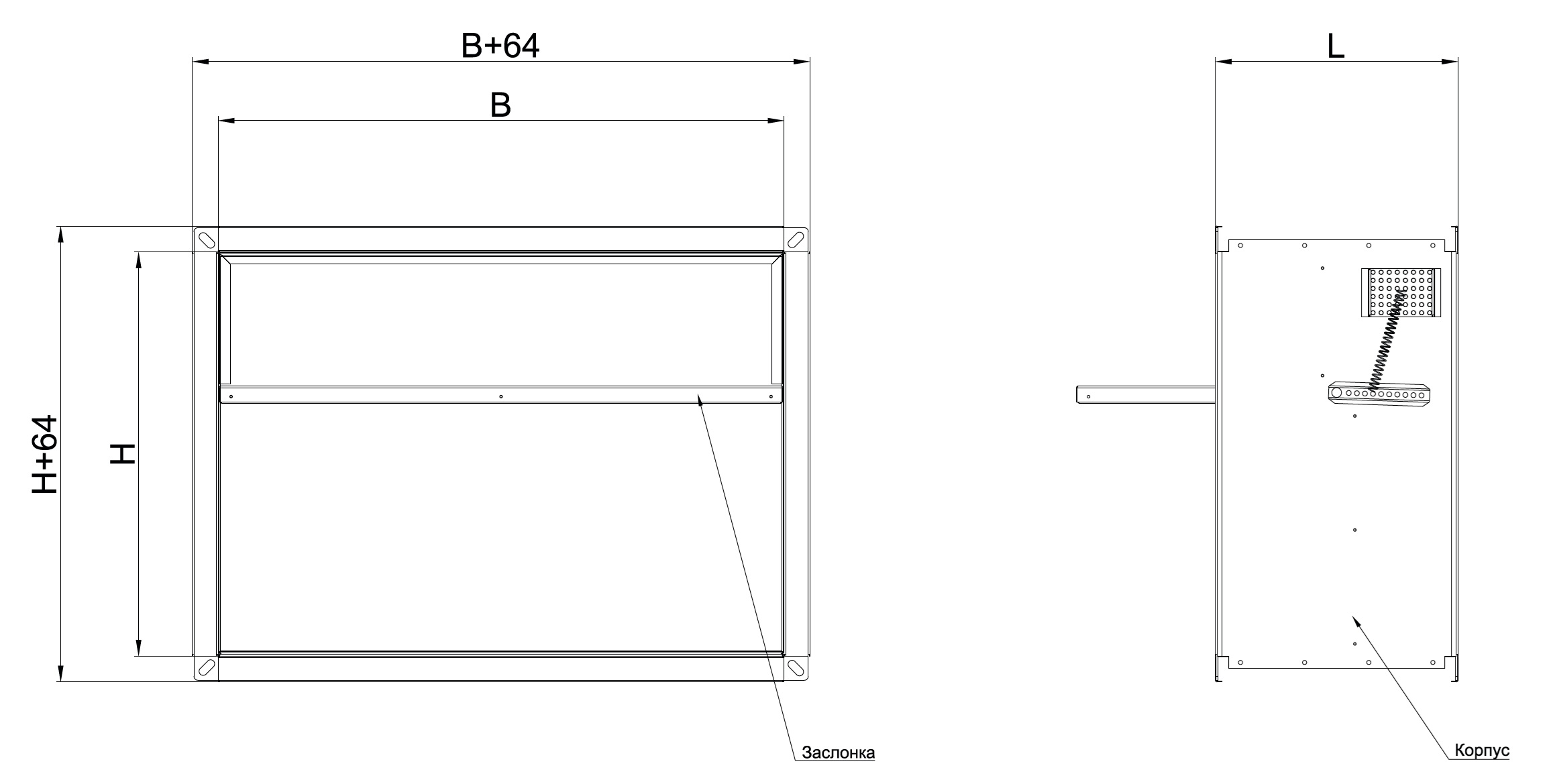 Корпус имеет глубину 300 мм и конструктивно аналогичен отрезку воздуховода такой же длины. Фланцы шириной 30 мм. Заслонка коробчатого типа набивается огнезащитным материалом. В качестве уплотнителя используется противопожарный уплотнитель (термоактивная лента).