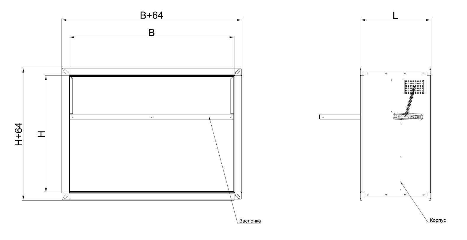 Корпус имеет глубину 300 мм и конструктивно аналогичен отрезку воздуховода такой же длины. Фланцы шириной 30 мм. Заслонка коробчатого типа набивается огнезащитным материалом. В качестве уплотнителя используется противопожарный уплотнитель (термоактивная лента).