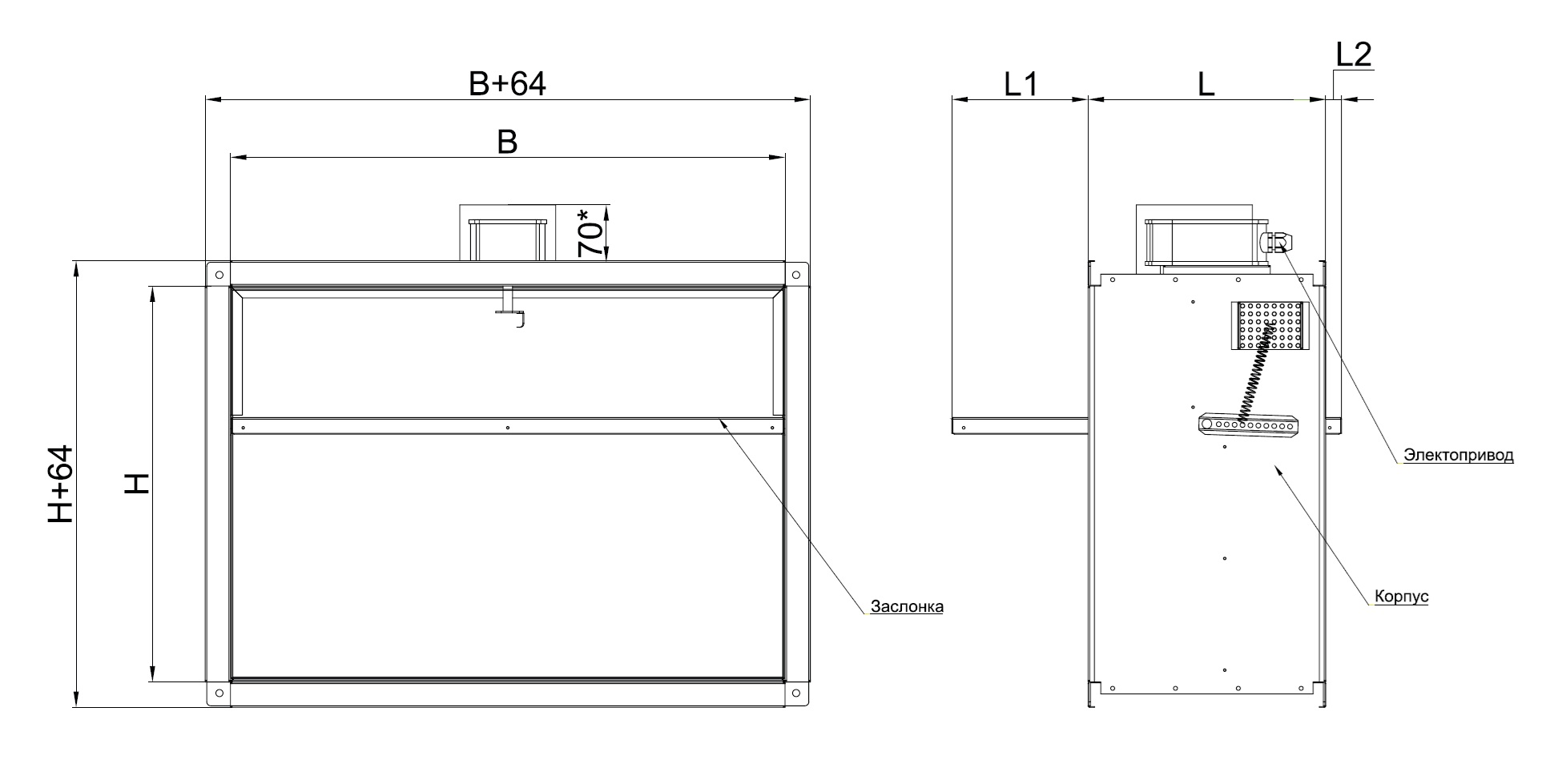 Корпус имеет глубину 300 мм и конструктивно аналогичен отрезку воздуховода такой же длины. Фланцы шириной 30 мм. Заслонка коробчатого типа набивается огнезащитным материалом. В качестве уплотнителя используется противопожарный уплотнитель (термоактивная лента).