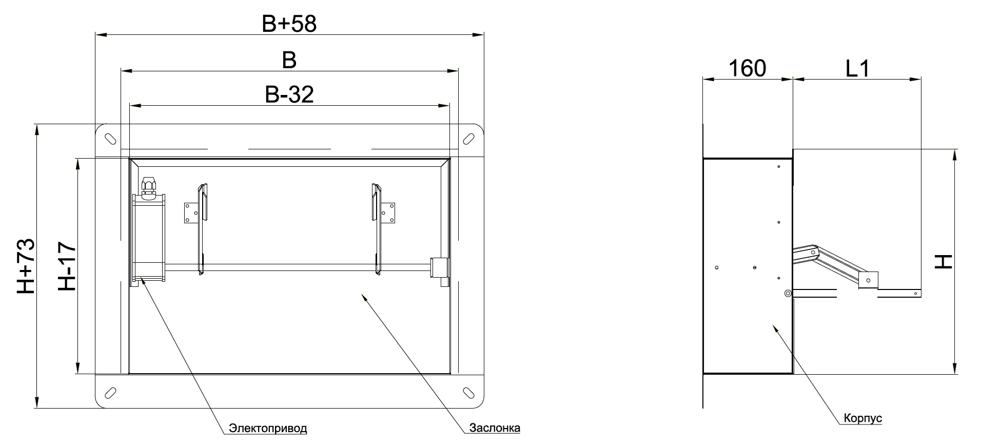 Корпус прямоугольного клапана, в зависимости от исполнения, имеет глубину от 200 мм до 250 мм и конструктивно аналогичен отрезку воздуховода такой же длины. Корпус стенового клапана, в зависимости от исполнения, имеет глубину от 160 мм до 250 мм.