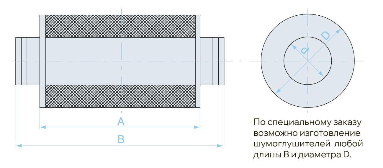 Трубчатый шумоглушитель предназначен для снижения уровня шума от вентиляторов. Максимальная температура перемещаемого воздуха составляет 70°С. Шумоглушитель выполняется в виду двух круглых воздуховодов из стального оцинкованного листа, вставленных один в другой. Пространство между наружным (гладким) и внутренним (из сетки) воздуховодами заполнено звукопоглощающим материалом (базальт кашированный). Монтаж шумоглушителя можно осуществлять в любом положении. Потеря давления на шумоглушителе трубчатого типа та же, что и на эквивалентном участке круглого воздуховода.