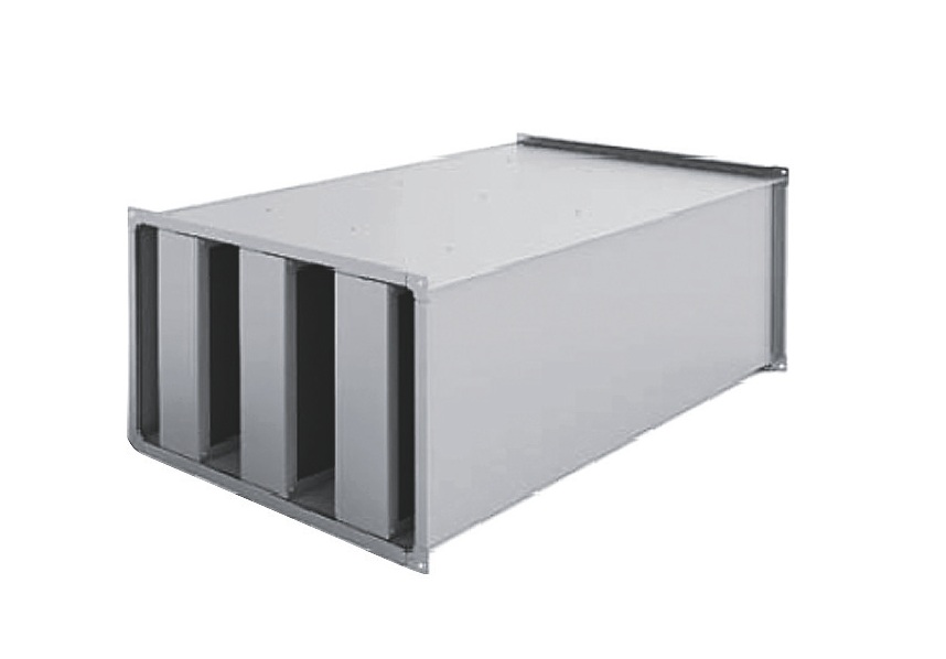 Шумоглушитель канальный пластинчатый применяется в системах вентиляции и кондиционирования воздуха и предназначен для снижения аэродинамического шума и вибрации, создаваемых вентиляторами, кондиционерами, отопительными агрегатами, воздухораздающими устройствами, а также шума, возникающего в элементах вентиляционной сети (воздуховоды) и распространяющегося по воздуховодам. Помимо этого, шумоглушитель снижает вибрацию, что повышает срок службы вентиляционной системы. Устанавливается непосредственно в прямоугольный канал систем вентиляции промышленных и общественных зданий. В стандартном исполнении корпус шумоглушителя изготовлен из оцинкованного стального листа. Внутри корпуса расположено от 2-х до 6-ти шумопоглощающих пластин в зависимости от типоразмера. Шумопоглощающие пластины состоят из негорючей базальто-волокнистой минеральной ваты, обтянутой стеклохолстом для предотвращения выдувания частиц. Лучшие показатели достигаются при низких скоростях перемещаемого воздуха. Монтаж в любом положении. Диапазон рабочих температур составляет от –40°С до +70°С.