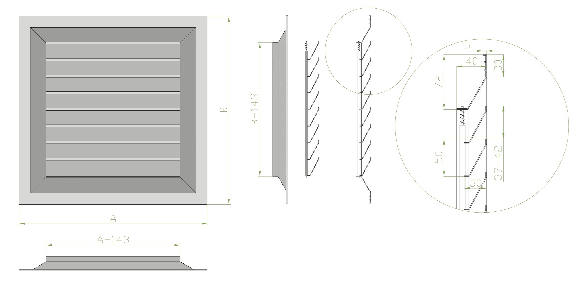 Решетка выполнена из алюминиевого профиля, представляет собой раму и центральное жалюзийное полотно, которое является съёмным, что способствует быстрому и простому монтажу. Наклон жалюзи к лицевой поверхности равен 30°.