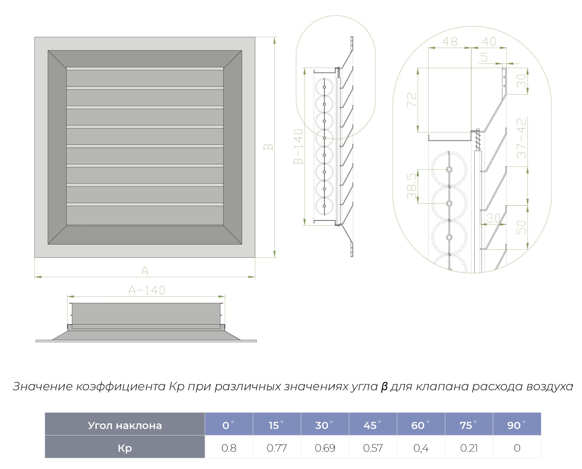 Возможна комплектация потолочной решетки клапаном расхода воздуха. Клапан расхода воздуха (БРВ) предназначен для регулирования объема поступающего в помещение воздуха. БРВ представляет собой рамку с установленными в неё лопатками. Положение лопаток регулируется при помощи ручки. Изменение положения лопаток позволяет изменять площадь свободного сечения решетки, тем самым регулируя объем подаваемого воздуха.