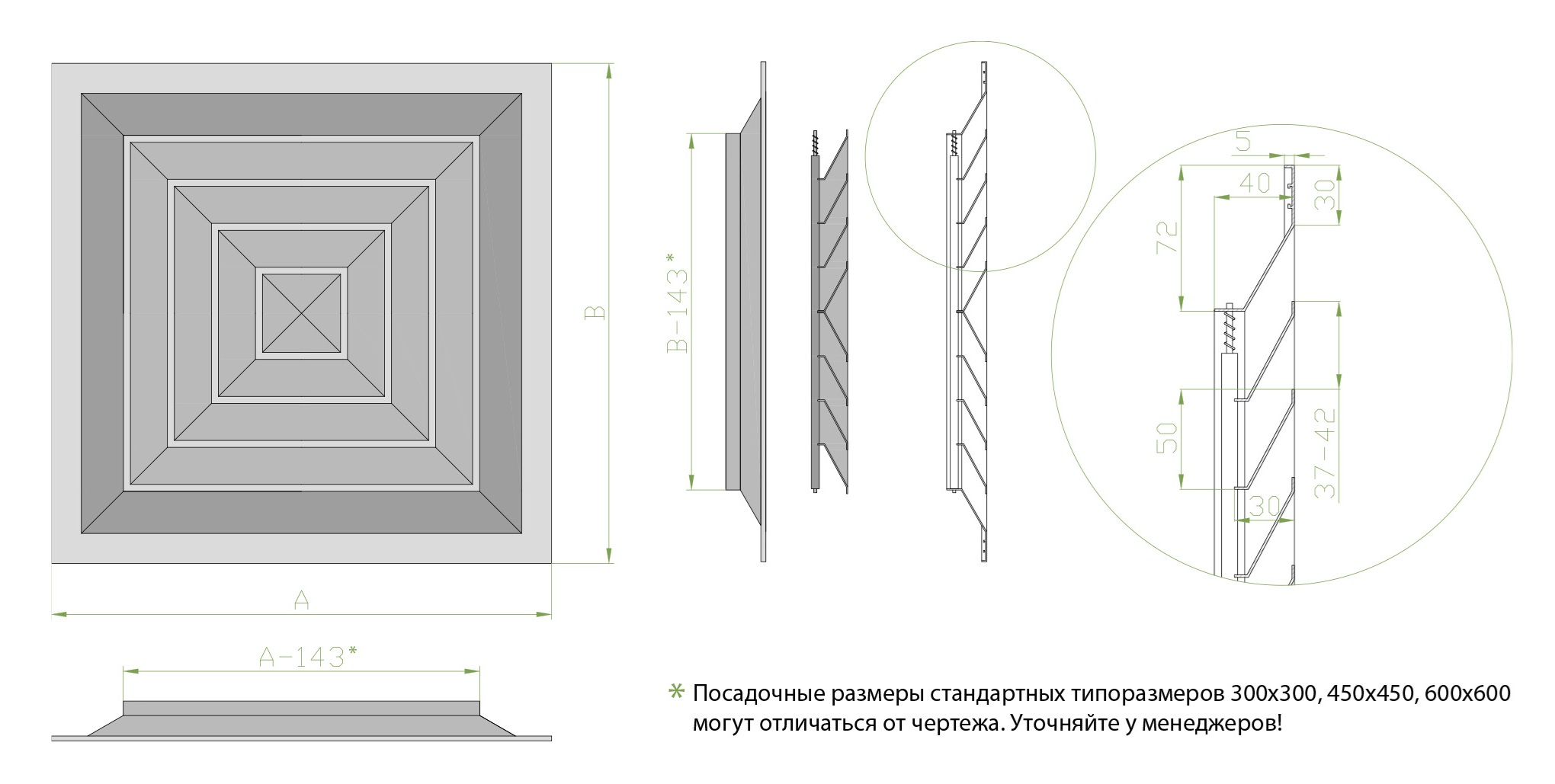 Стандартные размеры решетки 300х300 мм, 450х450 мм, 600х600 мм