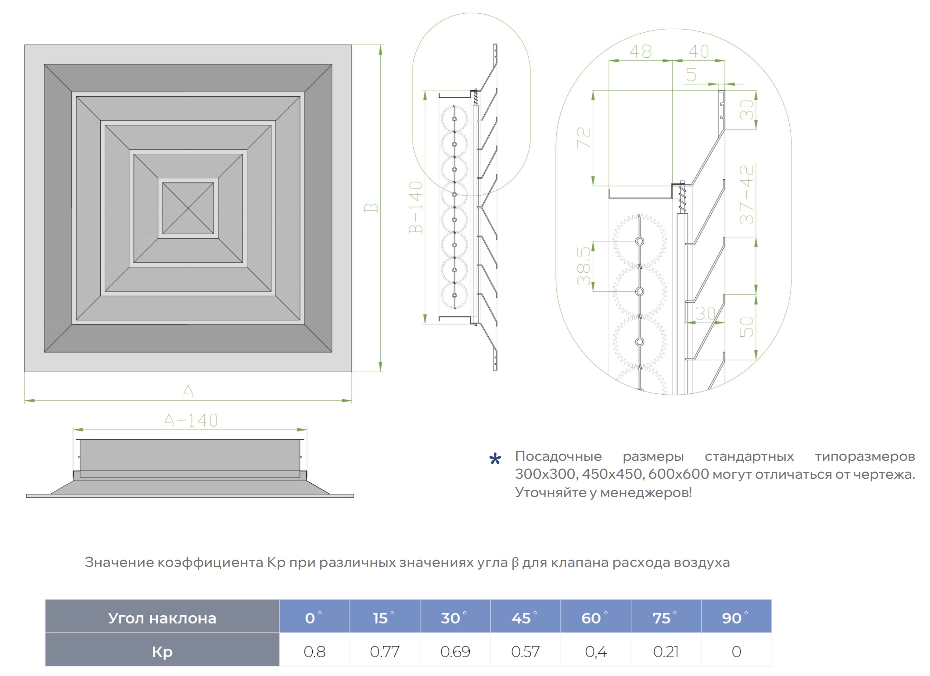 Конструктивные особенности данной модели позволяют увеличить посадочный размер решетки, при этом не изменяя в значительной степени объем подаваемого воздуха и аэродинамические свойства решетки относительно стандартной потолочной решетки 4РП.