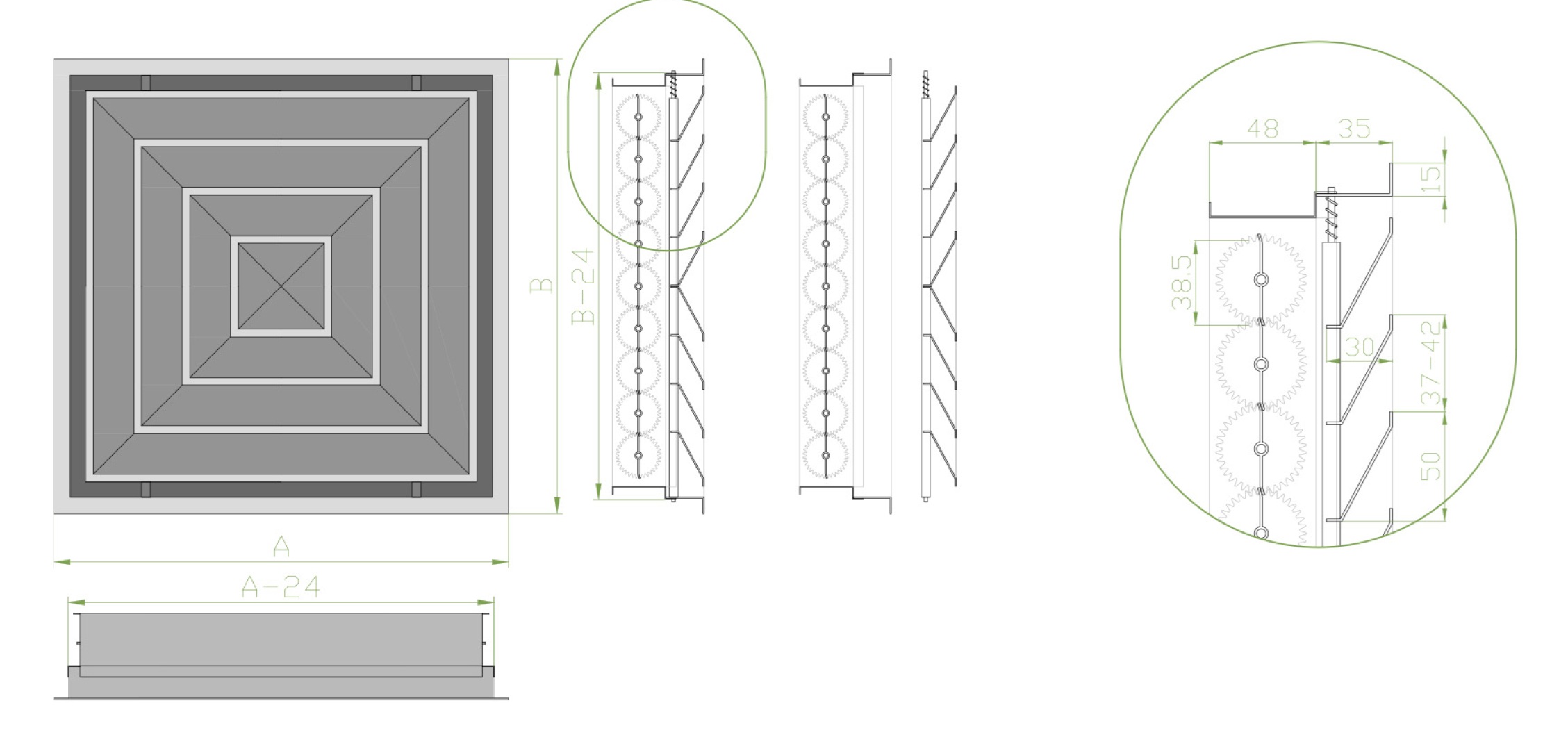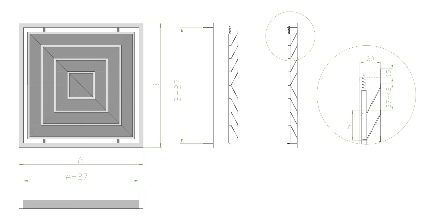 Решетка выполнена из алюминиевого профиля, представляет собой раму и центральное жалюзийное полотно, которое является съёмным, что способствует быстрому и простому монтажу. Наклон жалюзи к лицевой поверхности равен 30°.