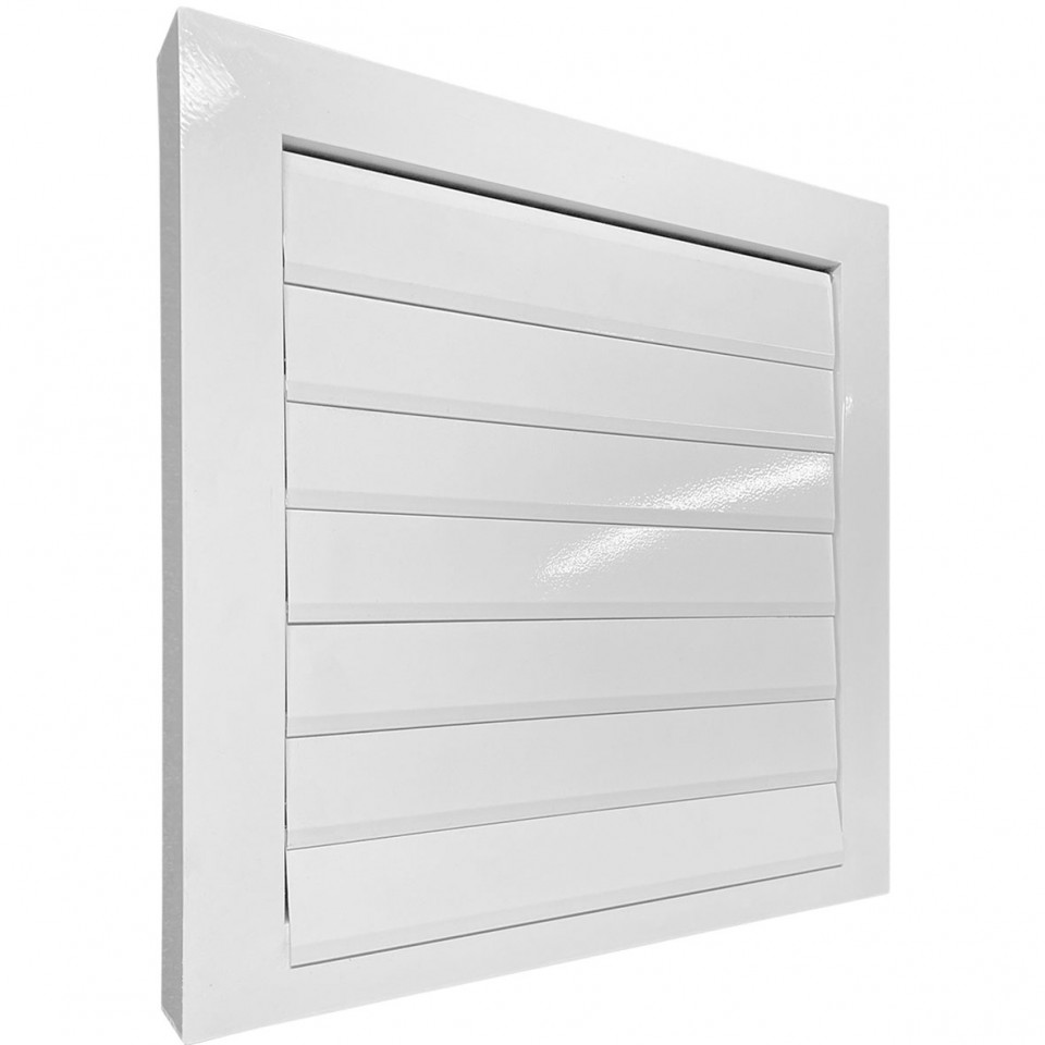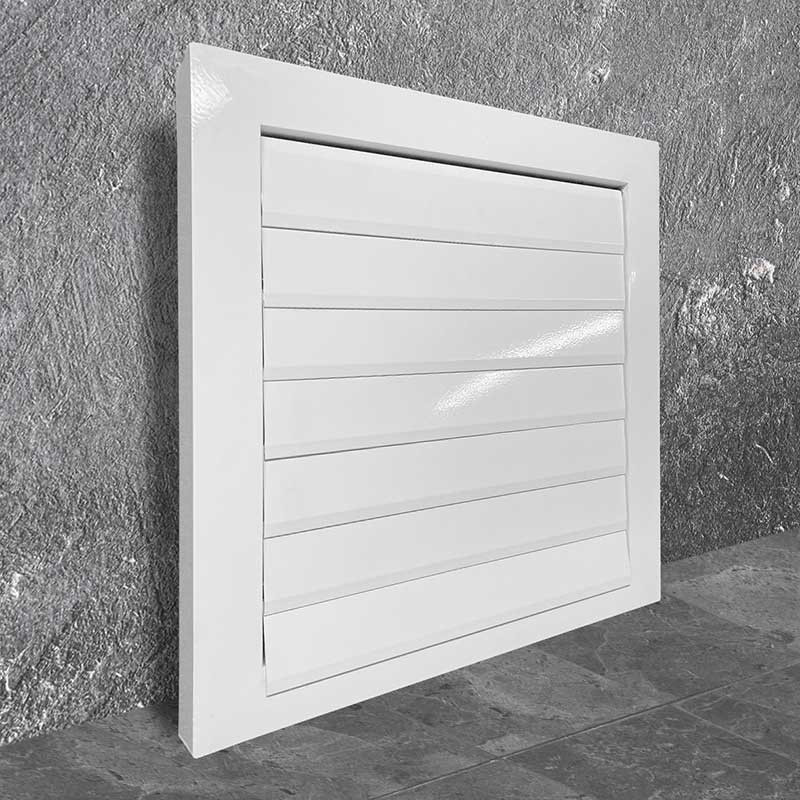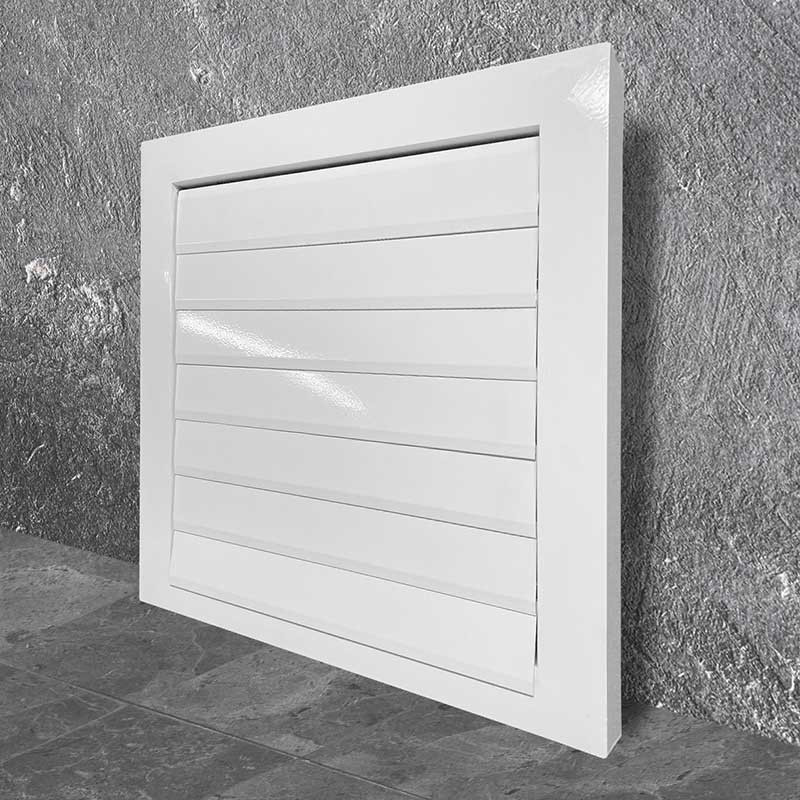 Инерционные решетки ГРН2 выполняют роль обратного клапана, пропуская воздушные потоки в одну сторону. Жалюзи решетки закрываются под силой собственного веса при выключенном вентиляторе, защищая от атмосферных осадков вентиляционный канал. При производстве используется швеллер 40х40 мм.