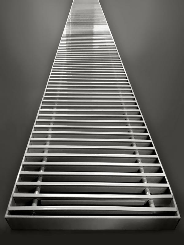 Конструкция напольных решеток РНП представляет собой гантелеобразные ламели, закрепленные между собой алюминиевой трубкой.