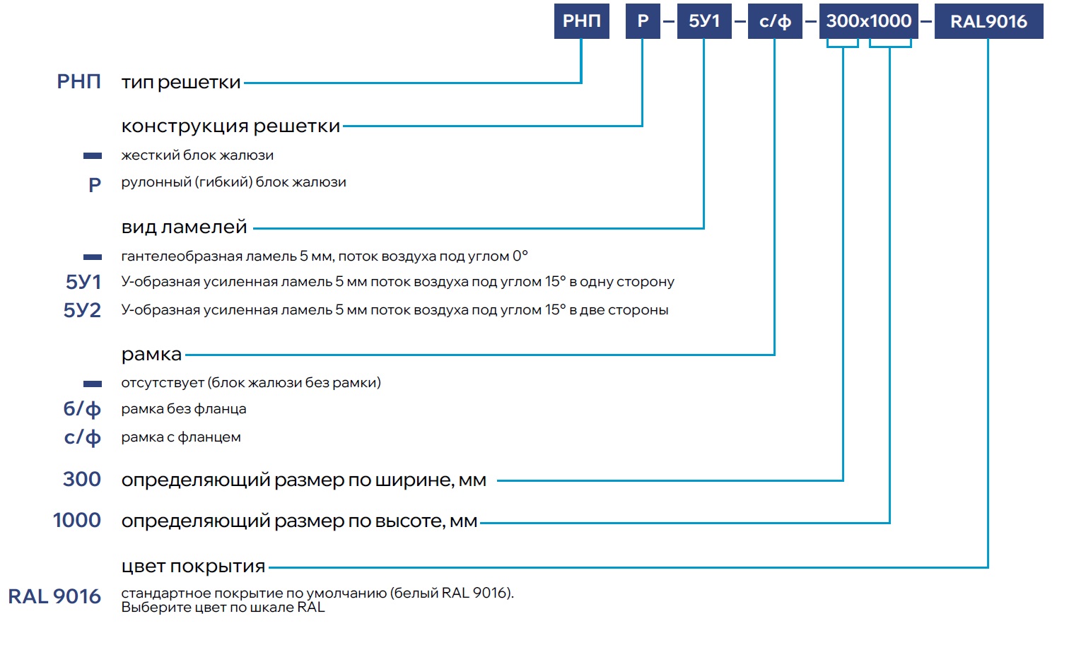 У-образные усиленные ламели 5 мм, угол которых зафиксирован под углом 0° относительно плоскости. Раздача воздуха происходит с углом отклонения 15° от нормали в одну сторону. Рекомендуется устанавливать на длинные решетки во избежание провисания ламелей.