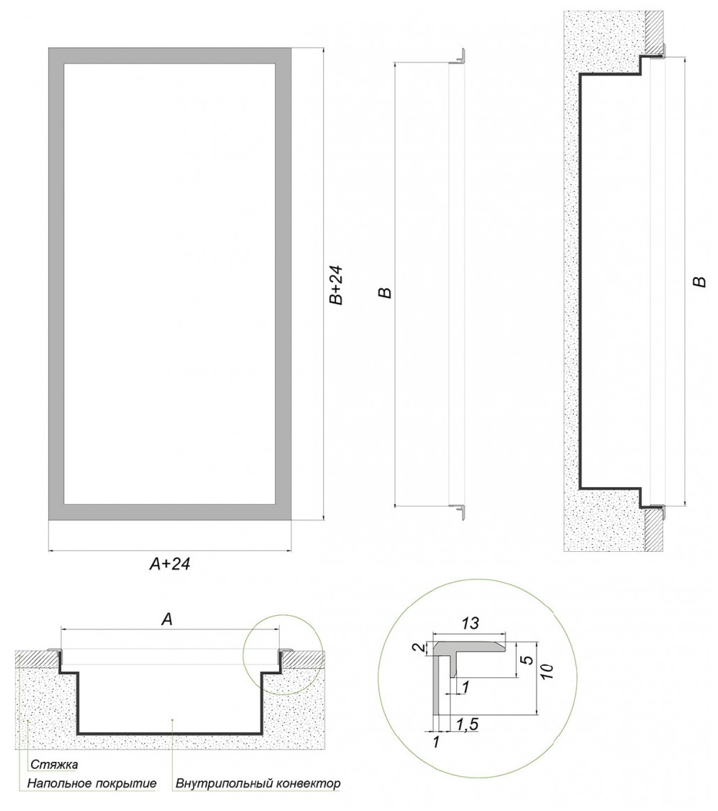 Рамки решеток внутрипольного конвектора предназначены для надежного и незаметного закрытия зазоров, образующихся при монтаже по краям конвектора. F-образный профиль позволяет монтировать конвектор в любую конструкцию пола. Скрывает стык между корпусом конвектора и напольным покрытием. Поставляется в цвет решетки.