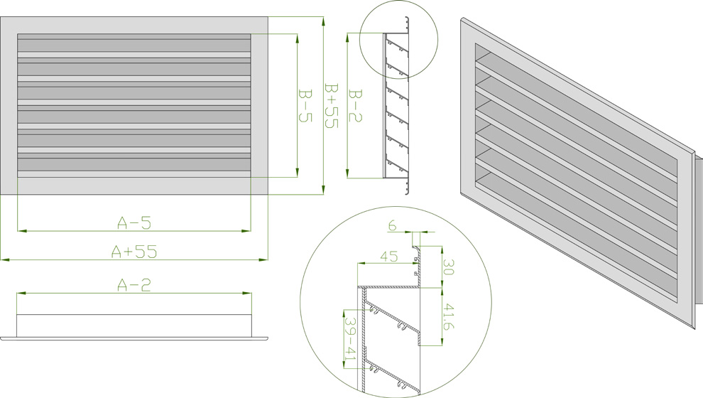 Наружная жалюзийная решетка ВР-40 применяется в приточно-вытяжной вентиляции для защиты воздуховода от осадков и посторонних предметов. Решетка представляет собой рамку из усиленного уголка 45х30, в которой неподвижно закреплены жалюзи Z-образной формы под углом 60˚. Еще одна важная отличительная особенность вентиляционной решётки ВР-40 – повышенный коэффициент живого сечения – 0,63, тогда как у обычной наружной решетки ФВР – 0,41.