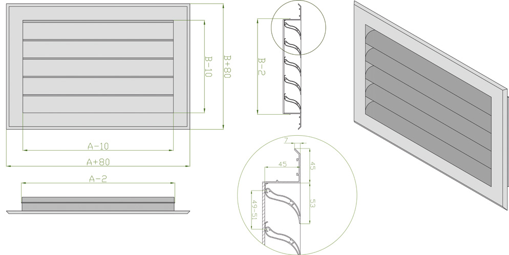 Предназначена для больших проемов. Данная модель отличается от остальных формой жалюзи – они имеют специальную полую S-образную форму с капельником и углом наклона 35˚, что придает решетке жесткость и устойчивость к ветровым нагрузкам при достаточно больших размерах, хорошие аэродинамические свойства и повышенный эстетический вид, а также обеспечивает надёжную защиту от попадания атмосферных осадков.