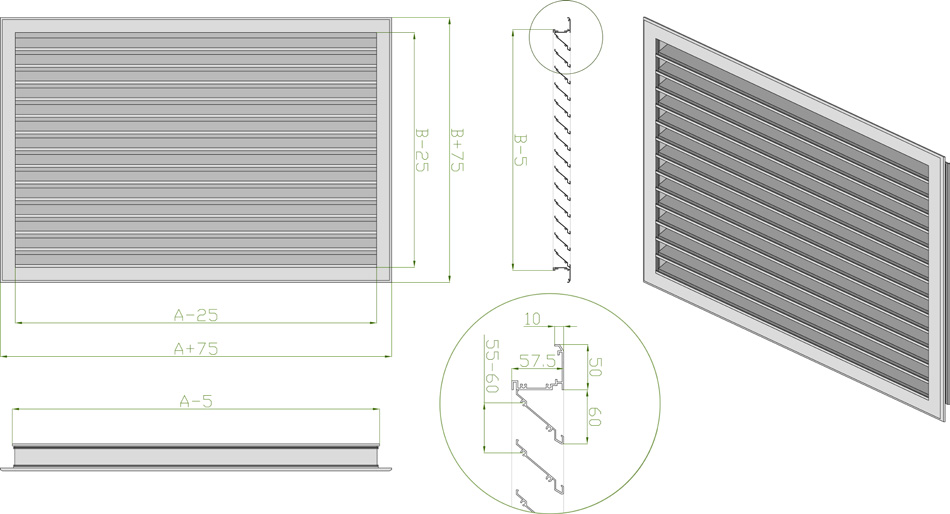 Жалюзийные решетки данной модели как и другие изготавливаться могут как прямоугольной, так и круглой или трапециевидной формы, но без возможности ручной или автоматической регулировки ламелей.