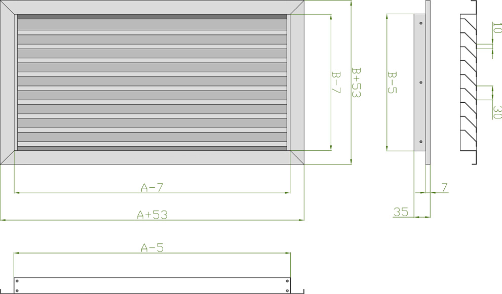 Решетка состоит из рамки и вставленных в рамку ламелей под углом 45 ˚. Конфигурация рамки и ламелей стандартная – согласно чертежа, по индивидуальному заказу возможна любая конфигурация, размерность рамки и ламелей.
