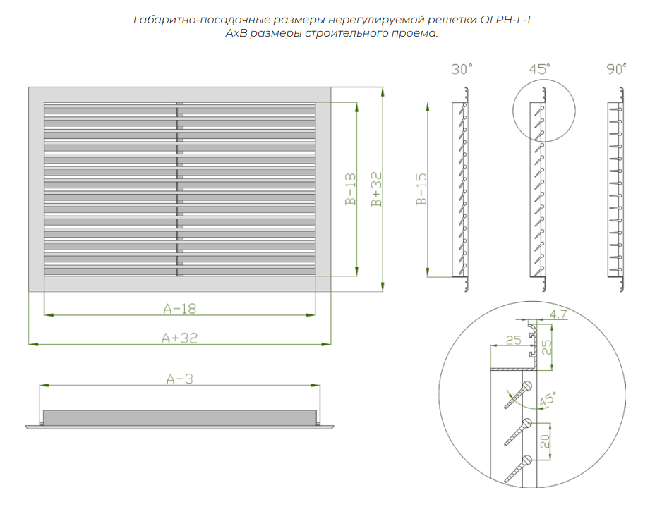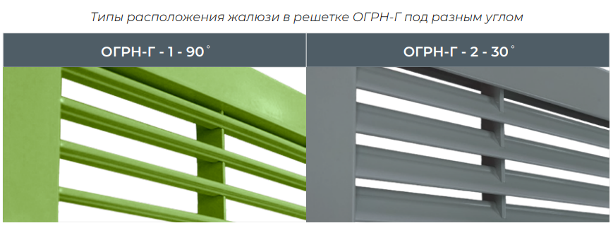 Решетка имеет рамку и горизонтально расположенные каплеобразные жалюзи, которые могут быть зафиксированы под углом 30˚, 45˚ и 90˚ специальной пластиной с вырезами, что исключает провисание жалюзи и повышает эстетический вид изделия. Жалюзи возможно расположить по типу 1 во внутреннюю сторону (ОГРН-Г-1) и по типу 2 во внешнюю сторону (ОГРН-Г-2).
