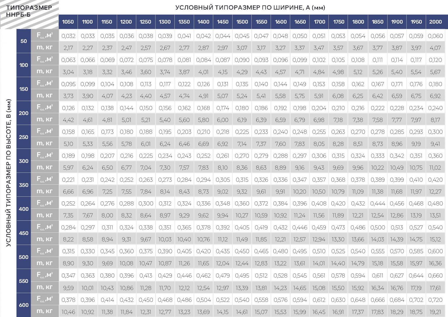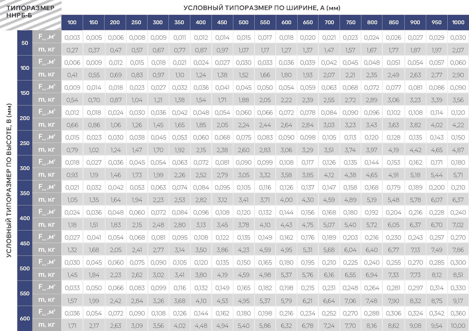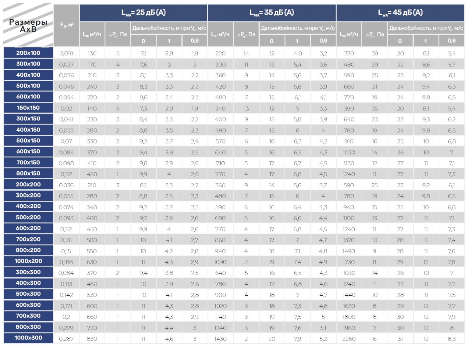 Данные для подбора решёток ННРБ-Б при подаче и удалении воздуха