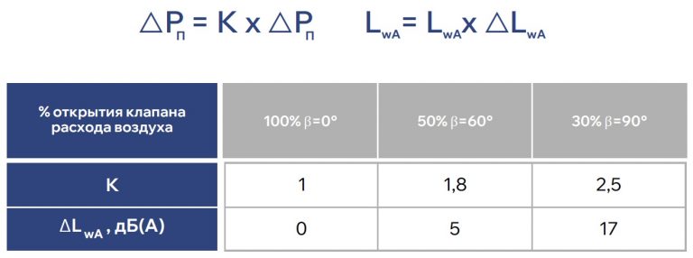 В решетках с регулятором расхода табличные значения значения ΔPп и LwA корректируются: