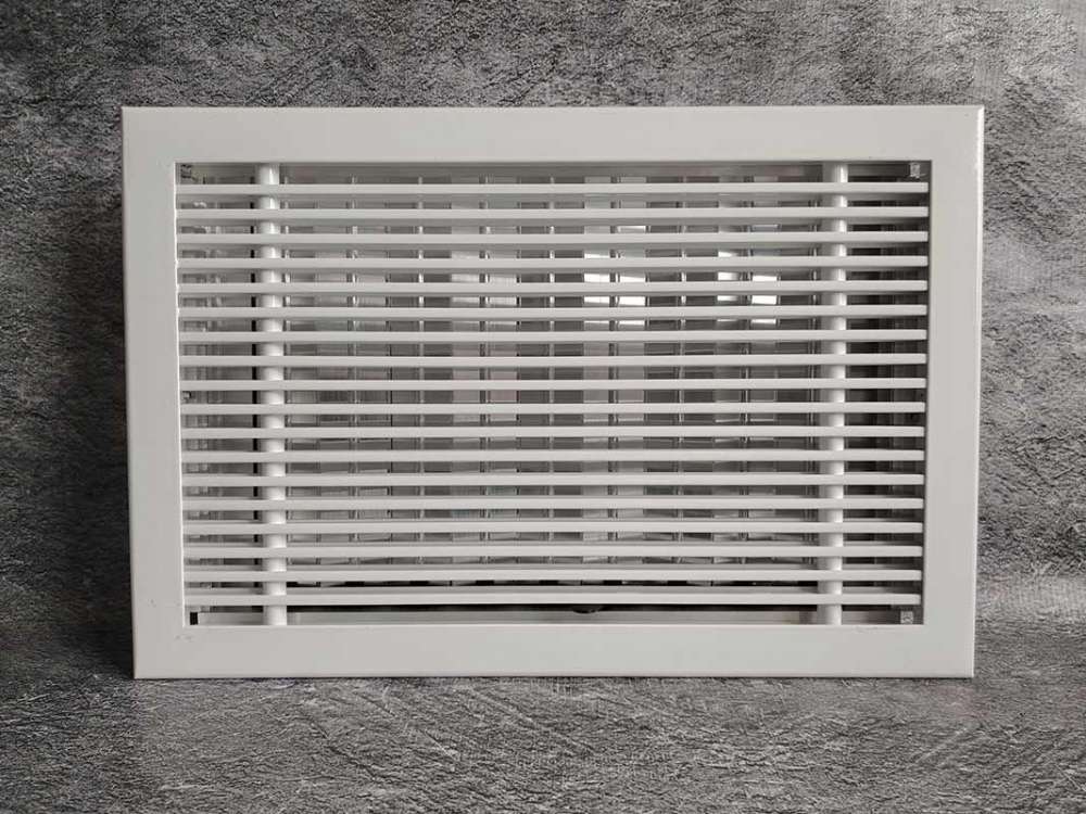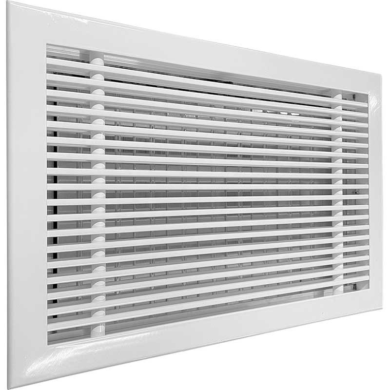 Нерегулируемая решетка с клапаном расхода воздуха ННРБ-Б используется в приточно-вытяжной вентиляции и системах кондиционирования воздуха и предназначена для установки в стены, потолки, где необходима повышенная прочность воздухораспределительного устройства. Решетка имеет рамку и горизонтально расположенные жалюзи из двутаврового профиля «гантеля». Жалюзи закреплены к рамке посредством армирующих алюминиевых трубок, что придает высокую прочность всей конструкции. Угол жалюзи зафиксирован под углом 0˚относительно плоскости. Раздача воздуха происходит с углом отклонения 0˚ от нормали. С тыльной части решетки установлен клапан расхода воздуха (БРВ). БРВ представляет собой рамку с установленными в неё лопатками. Положение лопаток регулируется при помощи ручки. Изменение положения лопаток позволяет изменять площадь свободного сечения решетки, тем самым регулируя объем подаваемого воздуха. По дополнительному запросу решетки ННРБ-Б могут быть оснащены отверстиями, расположенными на лицевой стороне рамки для крепления с помощью винтового соединения. Предусмотрена возможность оснащения адаптером для присоединения к воздуховоду. Решетки данного вида включают в себя изделия стандартных типоразмеров, а также возможно изготовление любых размеров с шагом 1 мм.