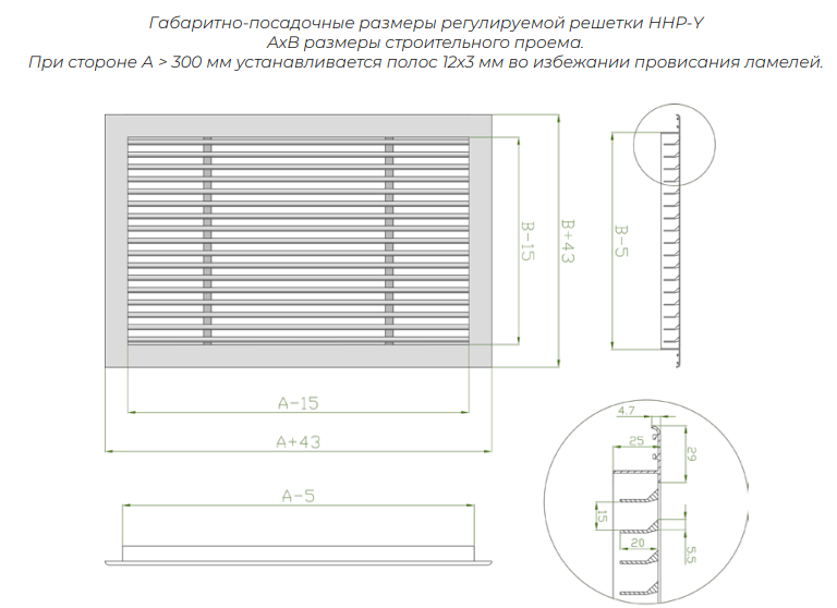 По дополнительному запросу решетки ННР-Y могут быть оснащены пружинной защелкой для скрытого монтажа либо отверстиями, расположенными на лицевой стороне рамки для крепления с помощью винтового соединения. Предусмотрена возможность оснащения клапаном расхода воздуха и адаптером для присоединения к воздуховоду.
