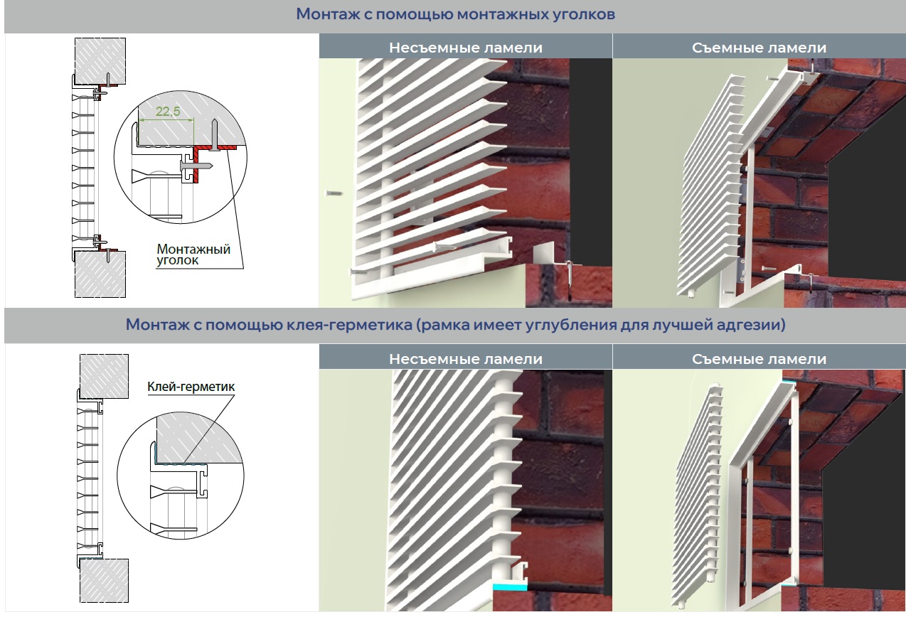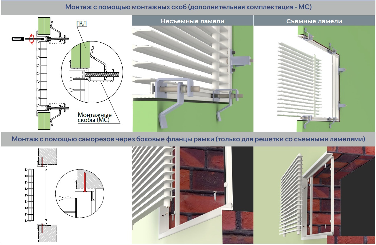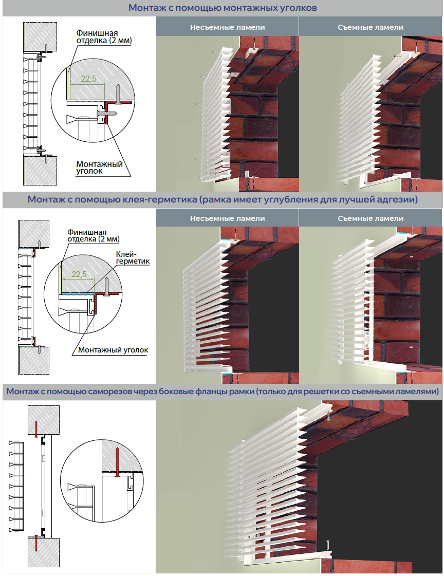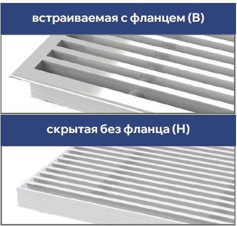 Встраиваемый тип исполнения, когда решетка имеет фланец, закрывающий неровные края строительного проема, а ламельное полотно решетки утапливается в проеме. Определяющими размерами АхВ являются размеры строительного проема.