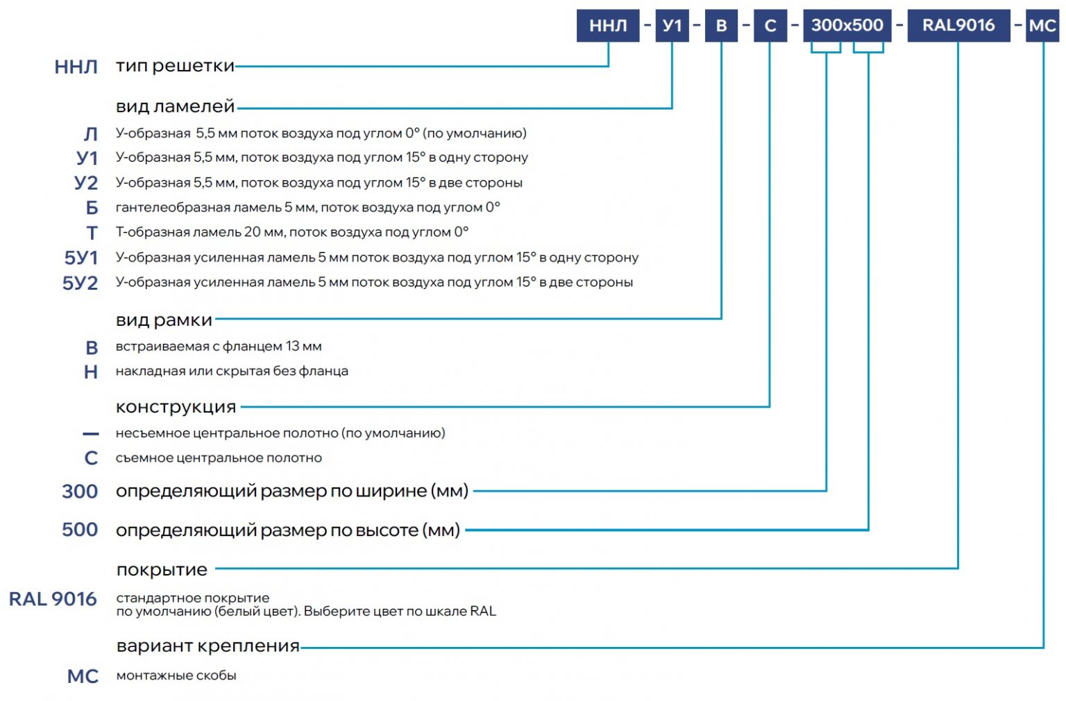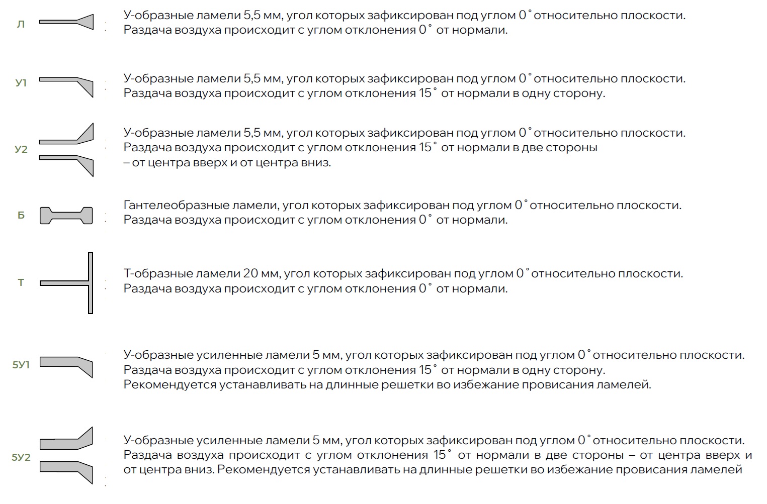 Решетка представляет собой рамку и горизонтально расположенные нерегулируемые ламели. Предлагается 7 вариантов центрального полотна из различных видов ламелей, отличающихся между собой внешним видом и аэродинамическими характеристиками.