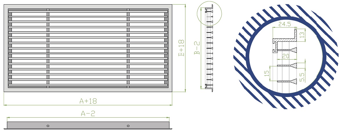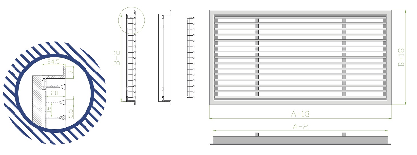 Скрытый тип исполнения, когда решетка полностью утапливается в проеме. Определяющими размерами АхВ являются габаритные размеры решетки.