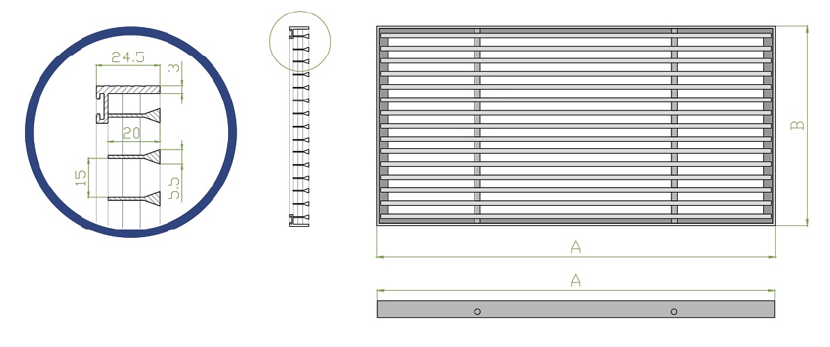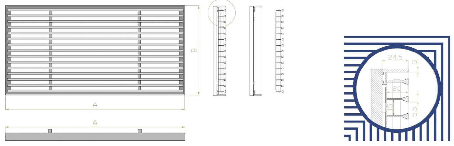 Габаритно-посадочные размеры встраиваемой решетки с фланцем со съемными ламелями ННЛ-Л-В-С. АхВ размеры строительного проема