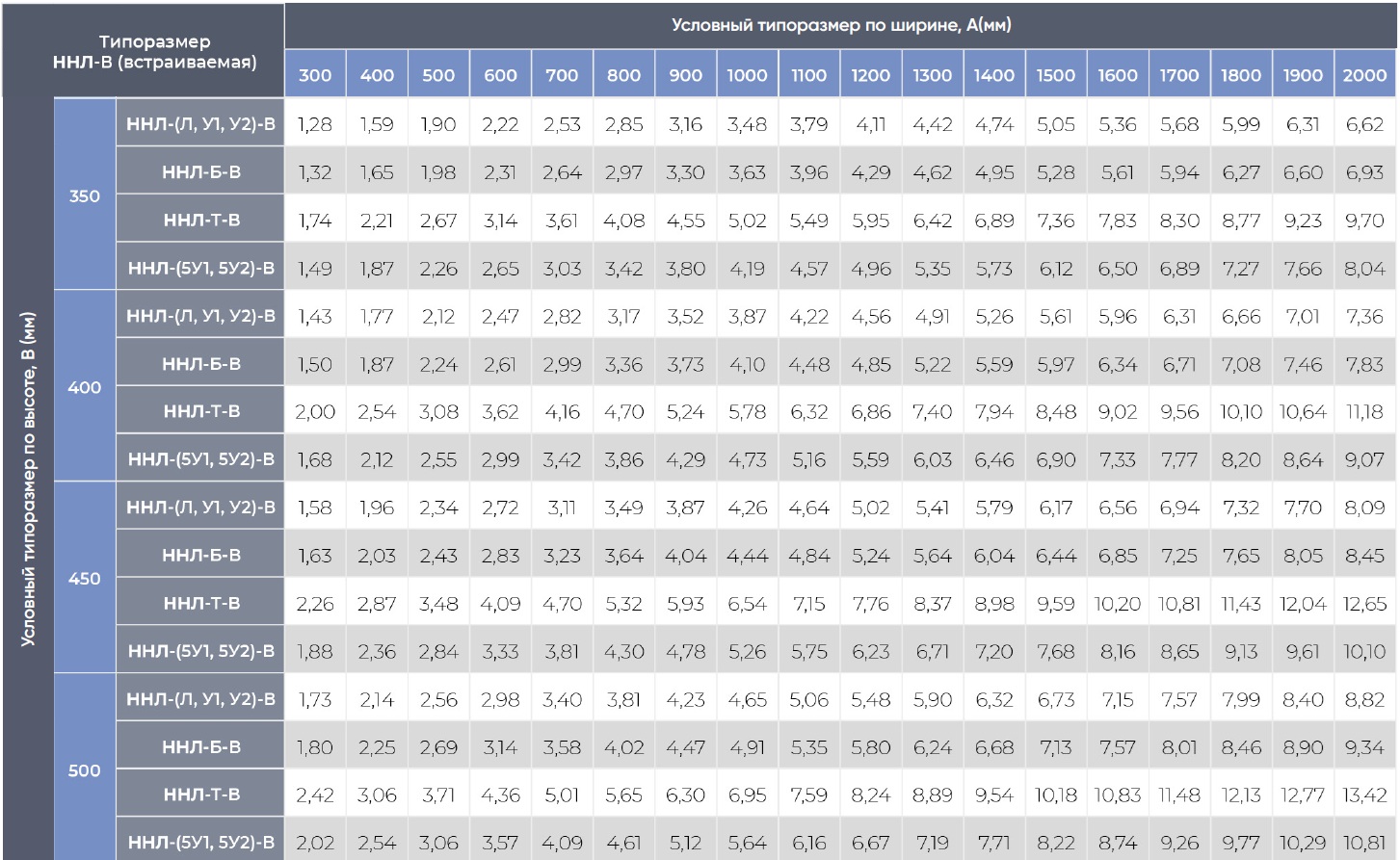 Стандартные типоразмеры, теоретическая масса (m, кг) встраиваемой решетки ННЛ-В