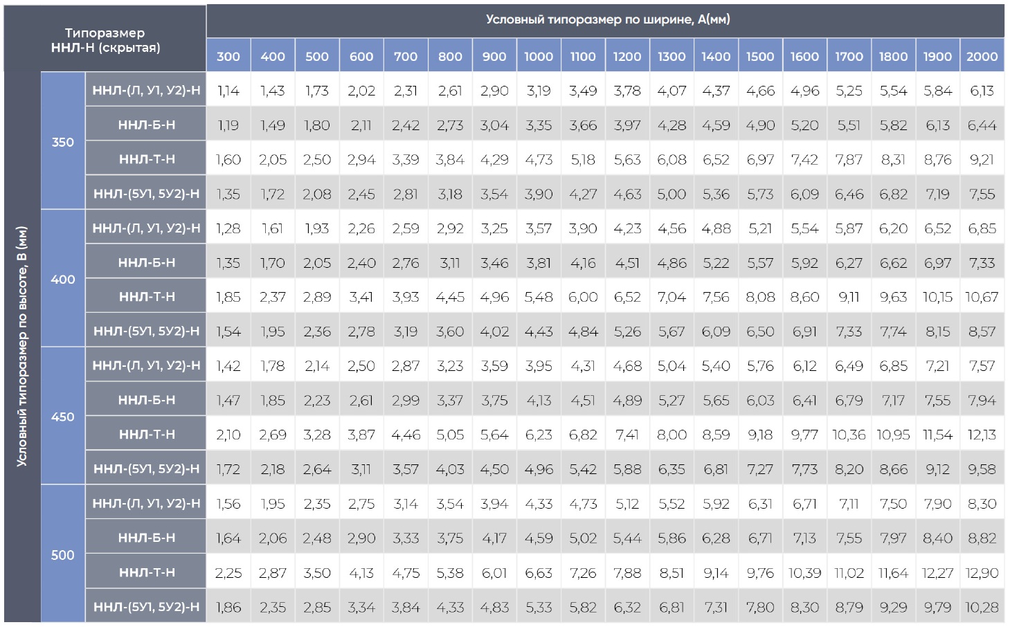 Стандартные типоразмеры, теоретическая масса (m, кг) скрытой решетки ННЛ-Н
