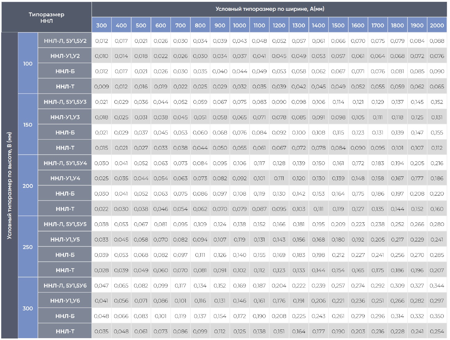 Стандартные типоразмеры, площадь свободного сечения (Fc.с., м2) ННЛ