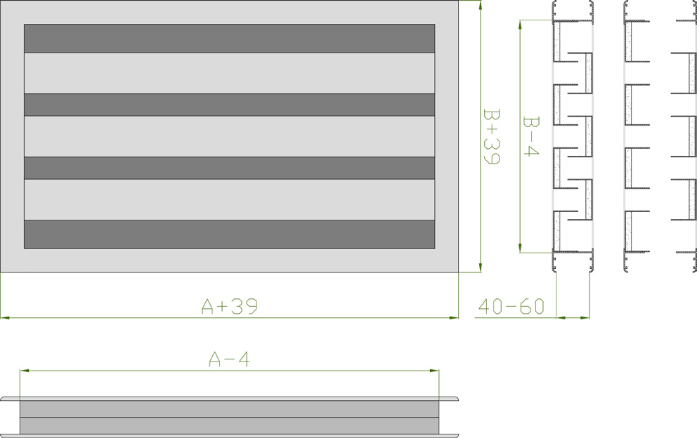 Переточные решетки звукопоглощающие РП-АКУСТИК применяются в системах вентиляции и кондиционирования и выполняют воздухораспределительную и шумопоглощающую функцию. Предназначены для монтажа в дверной или стенной проем, межкомнатные перегородки и прочие перекрытия для циркуляции воздуха между помещениями различных типов и назначения: административного, общественного и промышленного. Решетка РП-АКУСТИК состоит из двух решеток – наружной и ответной. В решетках неподвижно закреплены П-образные горизонтальные жалюзи обклеены шумопоглощающим материалом, препятствующие обзору и потоку звука сквозь решетку. Наружная и ответная решетка изготовлена из алюминиевого профиля в виде прямоугольной рамы. Наружная решетка устанавливается в дверной или стенной проем, а ответная решетка устанавливается с противоположенной стороны. Размеры решеток (глубина) позволяют устанавливать их на дверях или тонких перегородках толщиной от 40 до 60 мм. Решетки данного вида включают в себя изделия стандартных типоразмеров, а также возможно изготовление любых размеров с шагом 1 мм. Определяющим размером являются размеры строительного проема. Минимальные рекомендуемые размеры 100 мм, максимальные рекомендуемые размеры 1000 мм