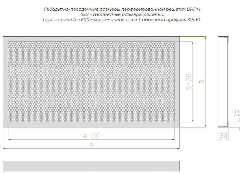 Перфорированная вентиляционная решетка ВРПН изготовлена из алюминиевой рамки, выполненной по накладному типу и перфорированного полотна прочно закрепленного к плоскости рамки. Конструкция изготавливается из алюминиевого профиля АД31 (ГОСТ 22233-2001). Изделие покрывается порошковой полиэфирной краской в базовый белый цвет (RAL 9016), под заказ – в любой оттенок (по международному каталогу RAL). Размерный ряд изделий включает в себя стандартные типоразмеры.