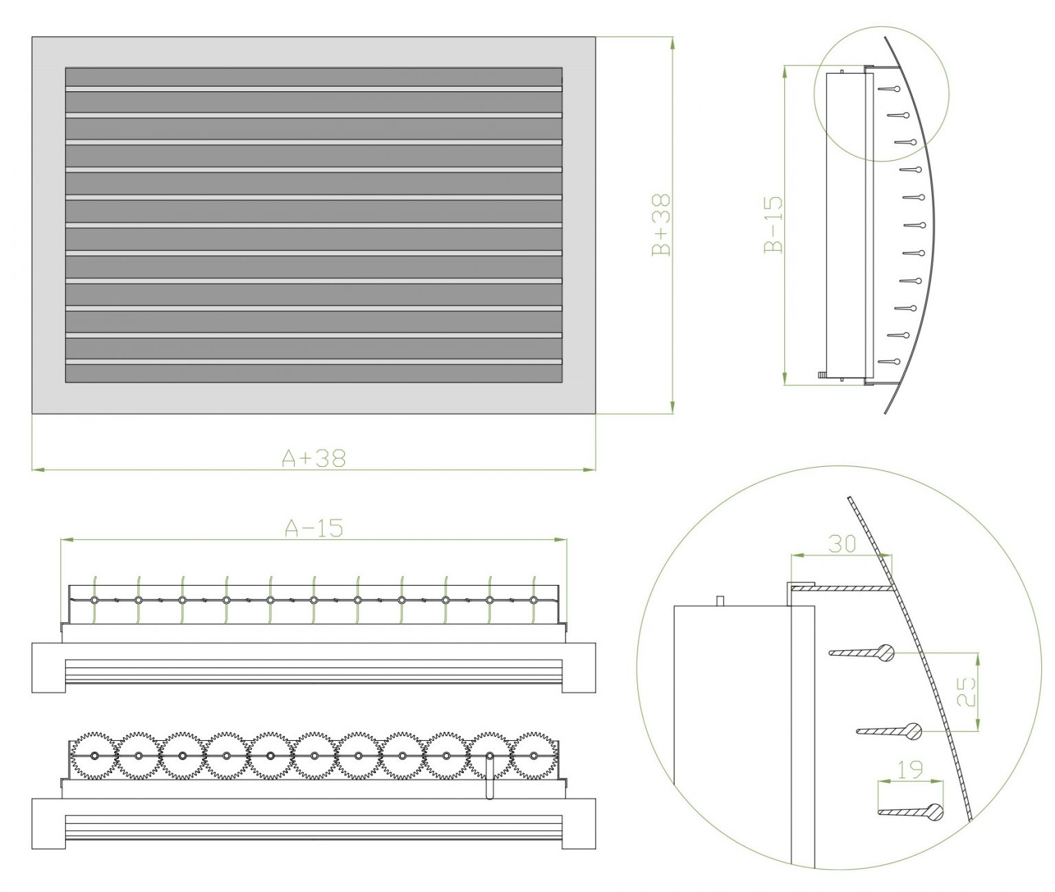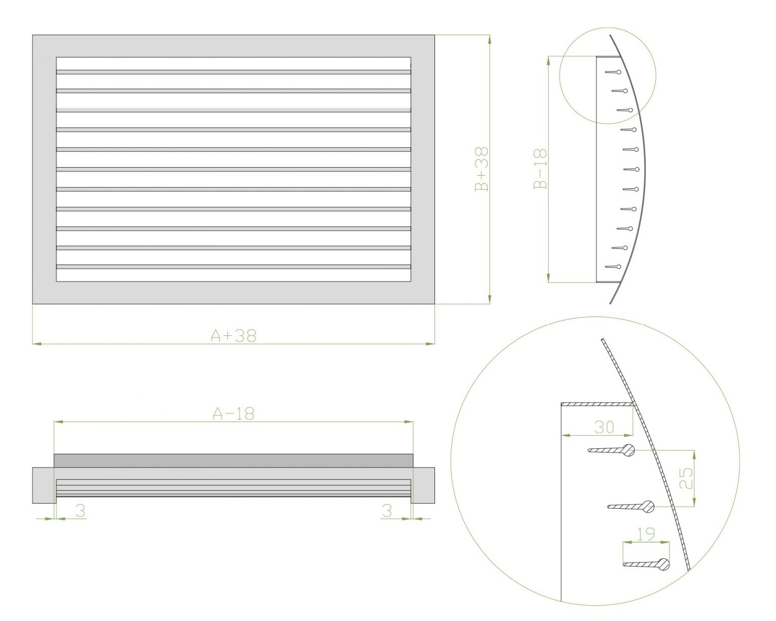 Возможна поставка решеток в комплекте с выкрашенными в цвет решетки саморезами. По умолчанию решетки поставляются без саморезов, без крепежных отверстий в рамке.