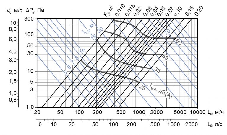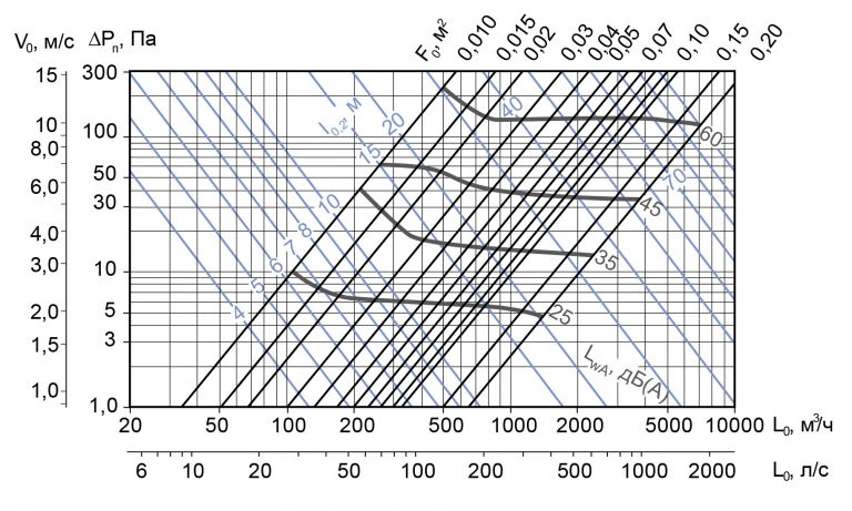 Диаграмма для подбора типоразмера и определения аэродинамических характеристик