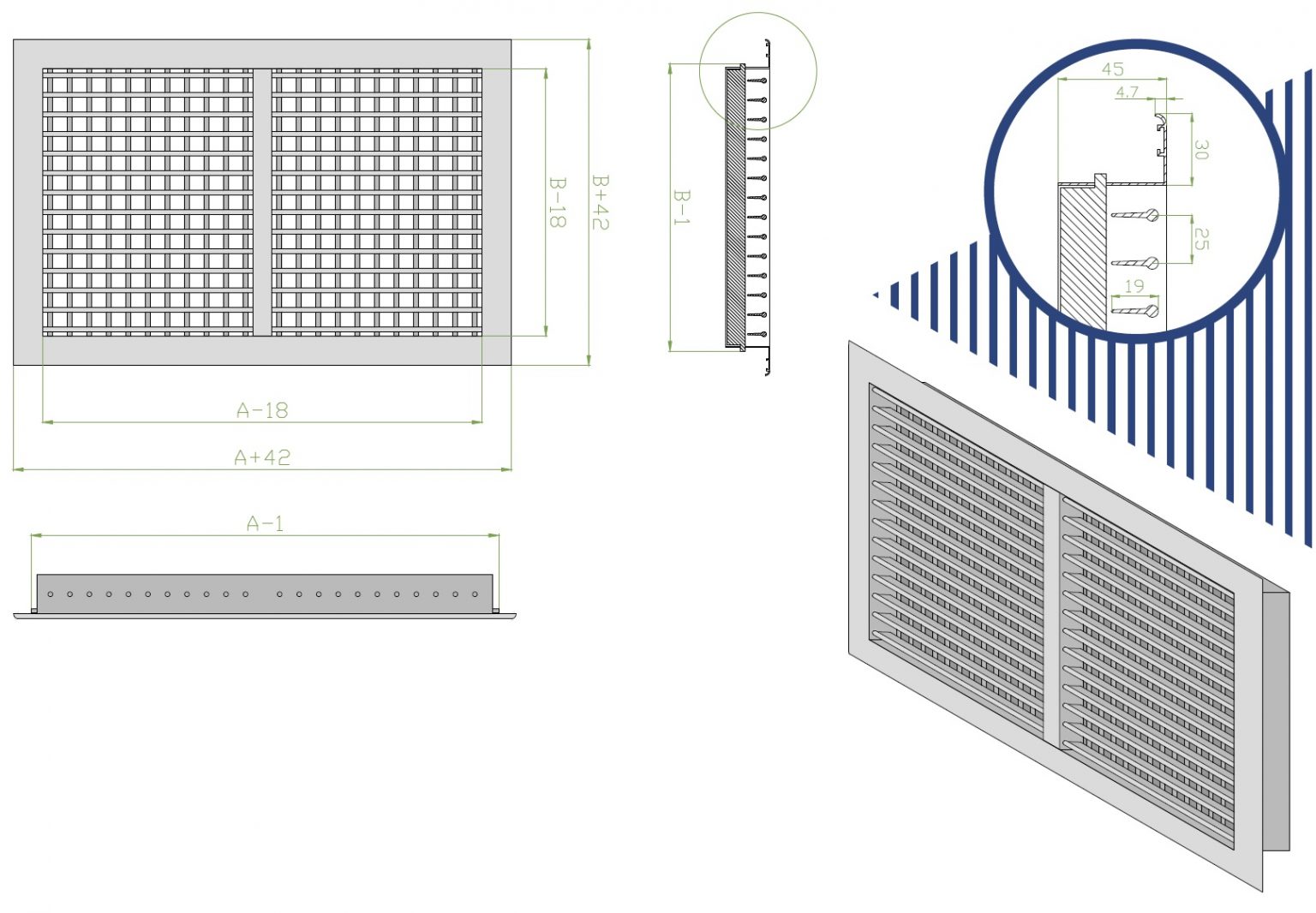 Двухрядная регулируемая решетка ДВР используется в приточно-вытяжной вентиляции и системах кондиционирования воздуха и предназначена для регулировки направления воздушного потока вверх/вниз и влево/вправо. При этом можно как расширять поток, так и сужать его и направлять в определенную сторону помещения. Решетки ДВР монтируются в вентиляционные каналы и строительные проемы различных типов.