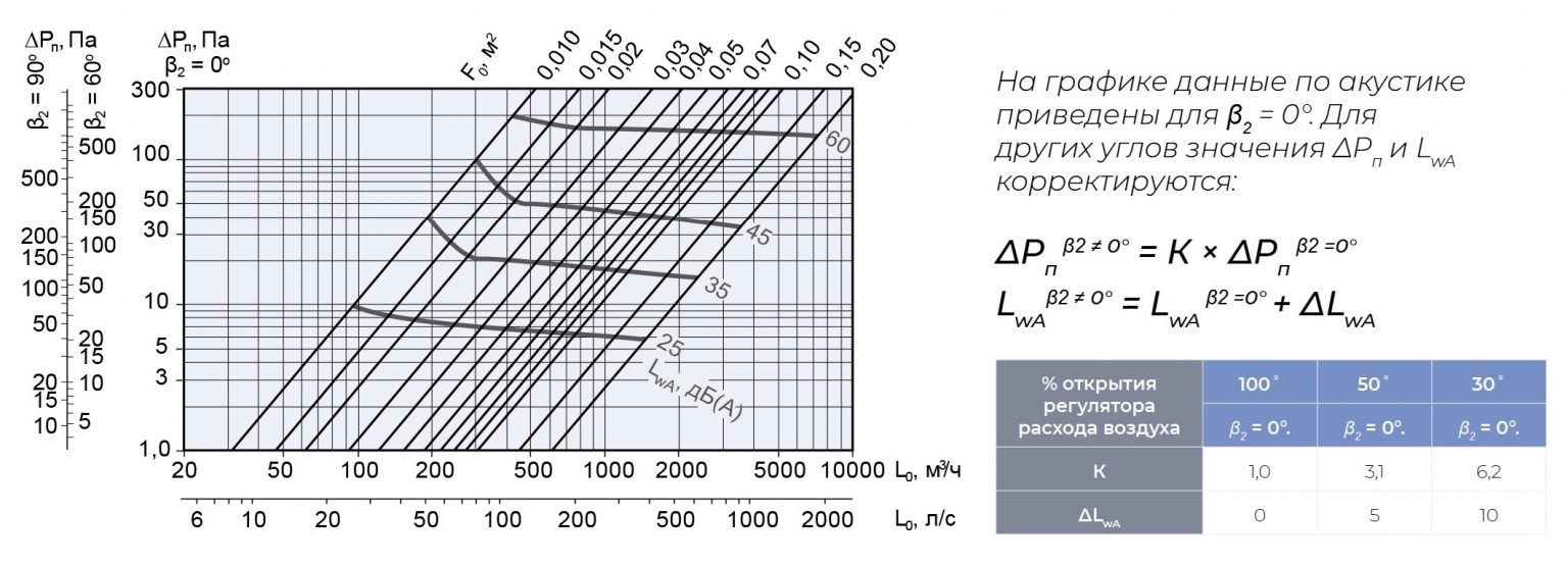 Аэродинамические и акустические характеристики решеток ДВРЦ-РП при углах наклона жалюзи α1= 45° – в одну сторону, α2 =0°