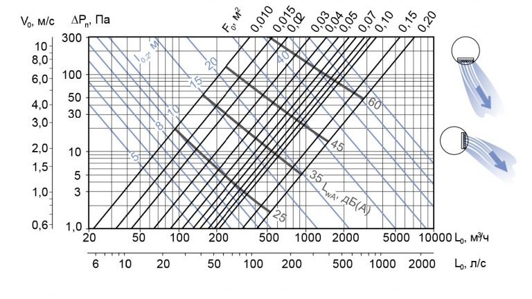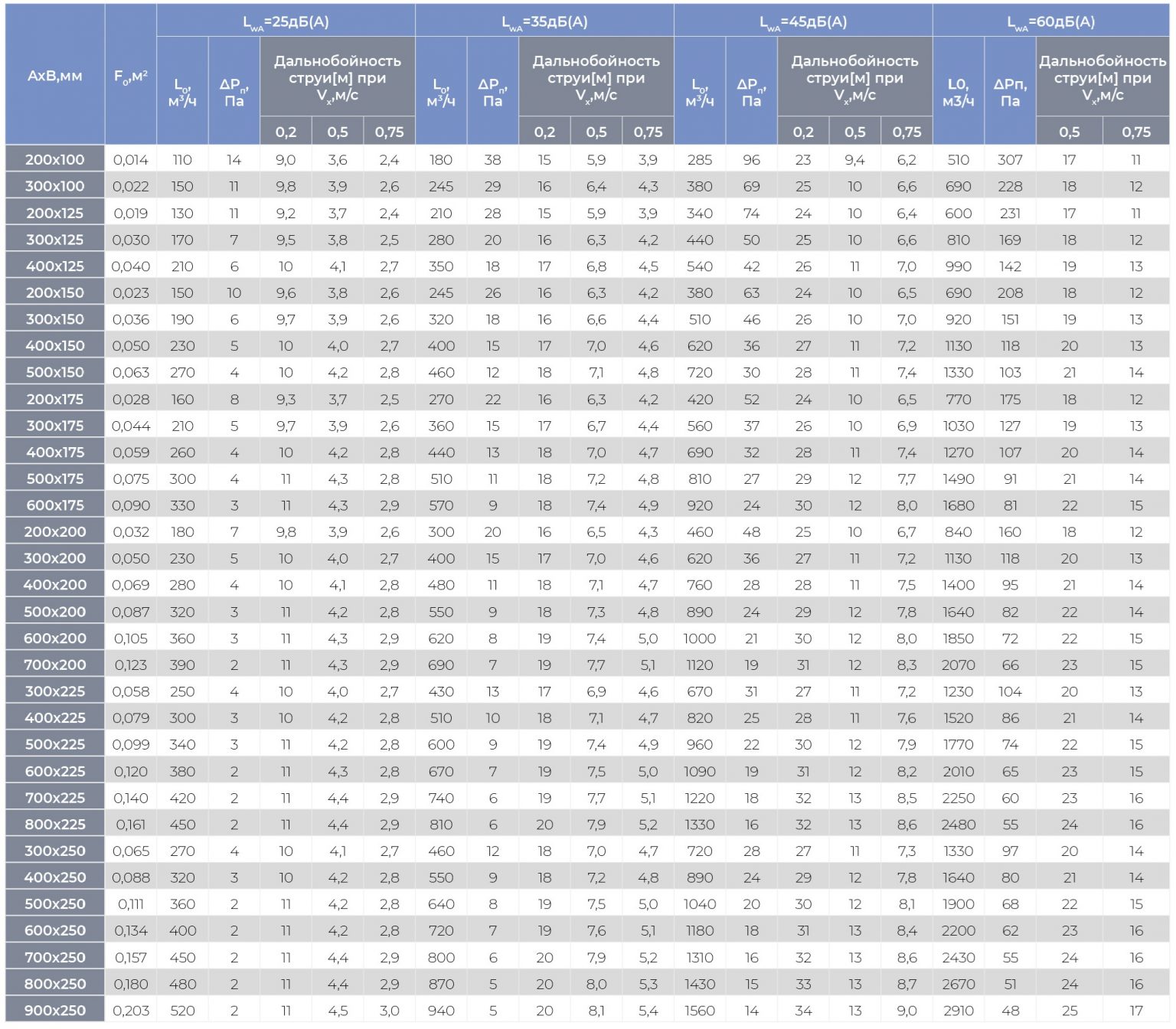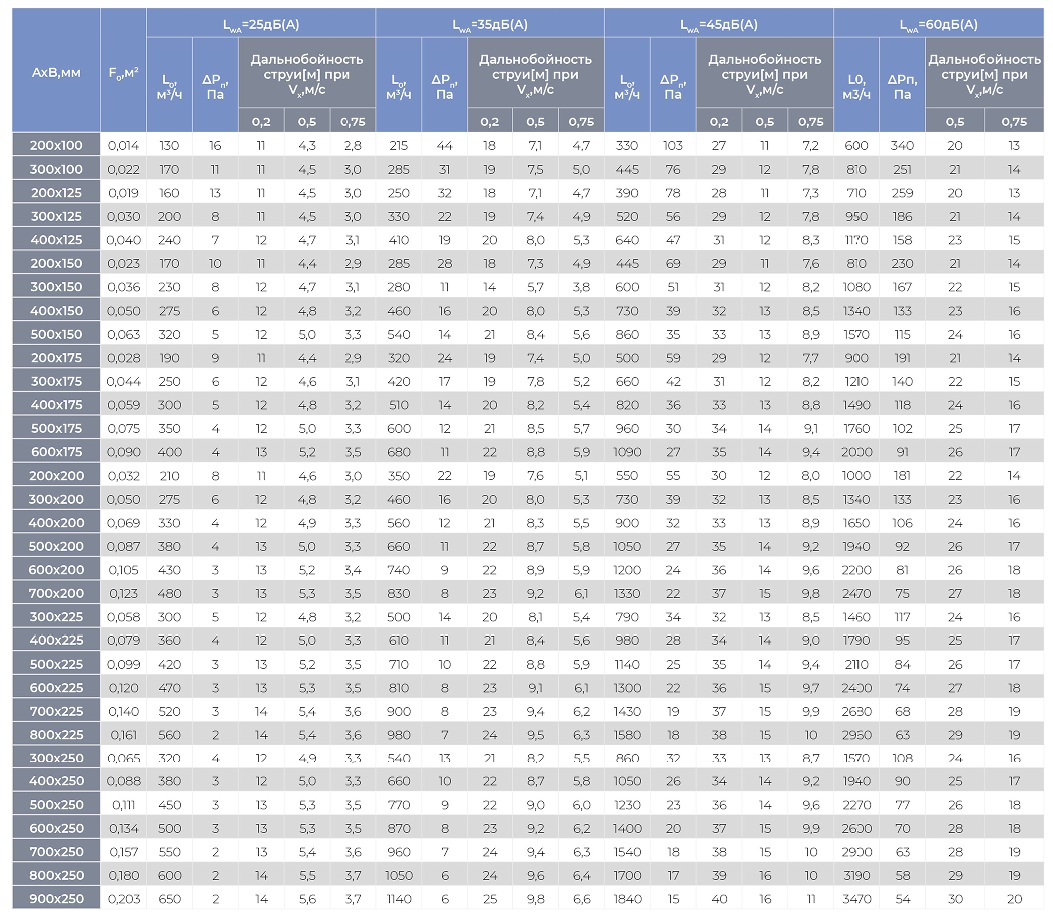 Данные для подбора для подбора решеток ДВРЦ, ДВРЦ-Р при углах наклона жалюзи α1= 0°, α2 = 0°